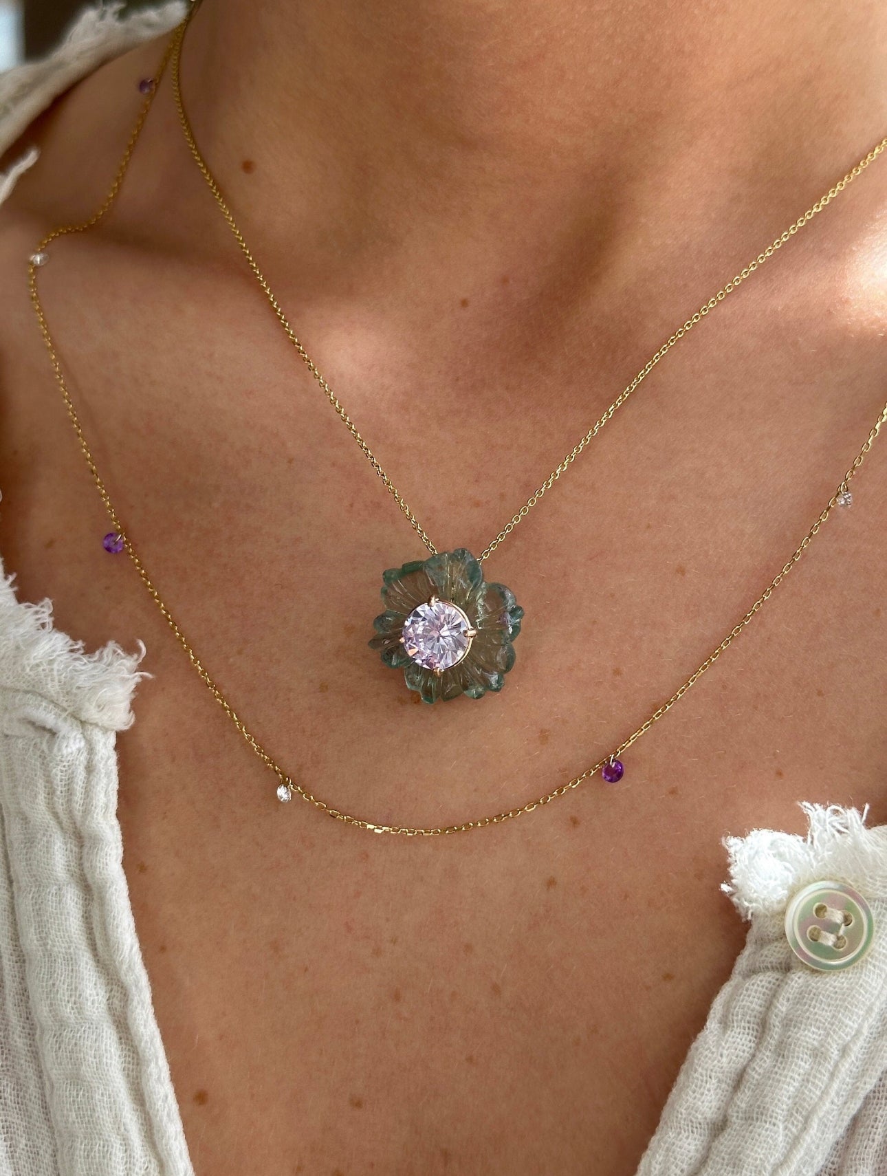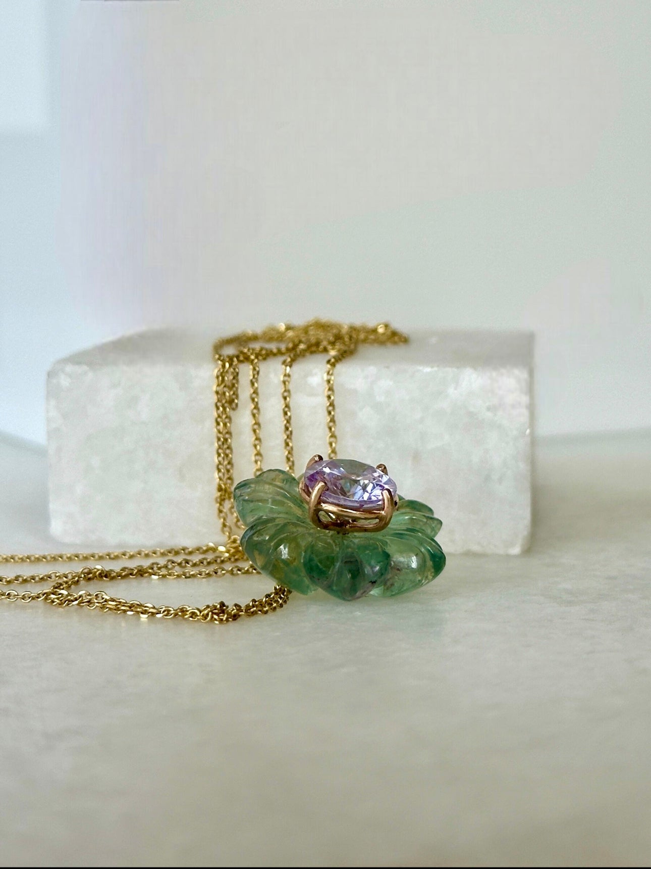 Blooming Green Fluorite Lilac Zircon Pendant 14k, Solid Gold Pendant