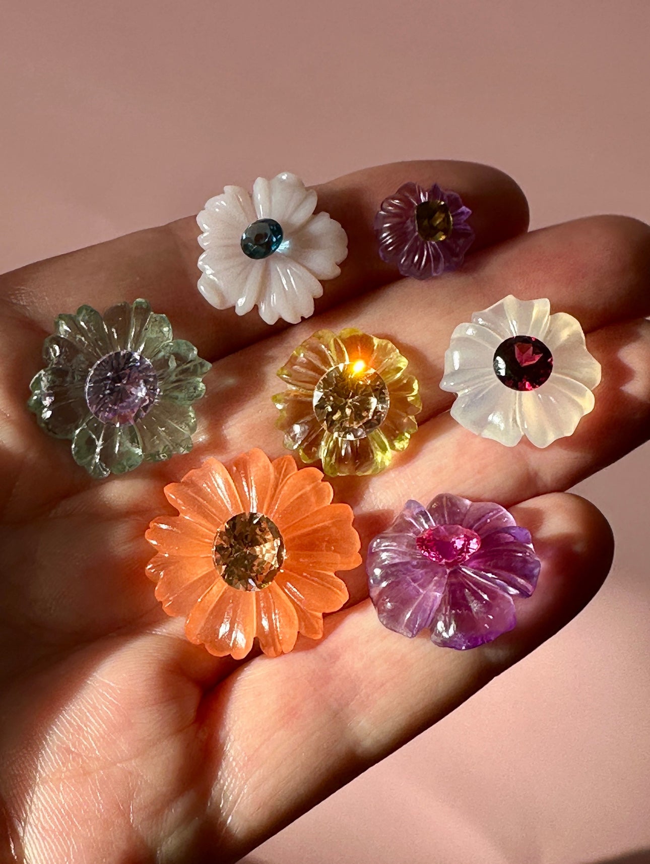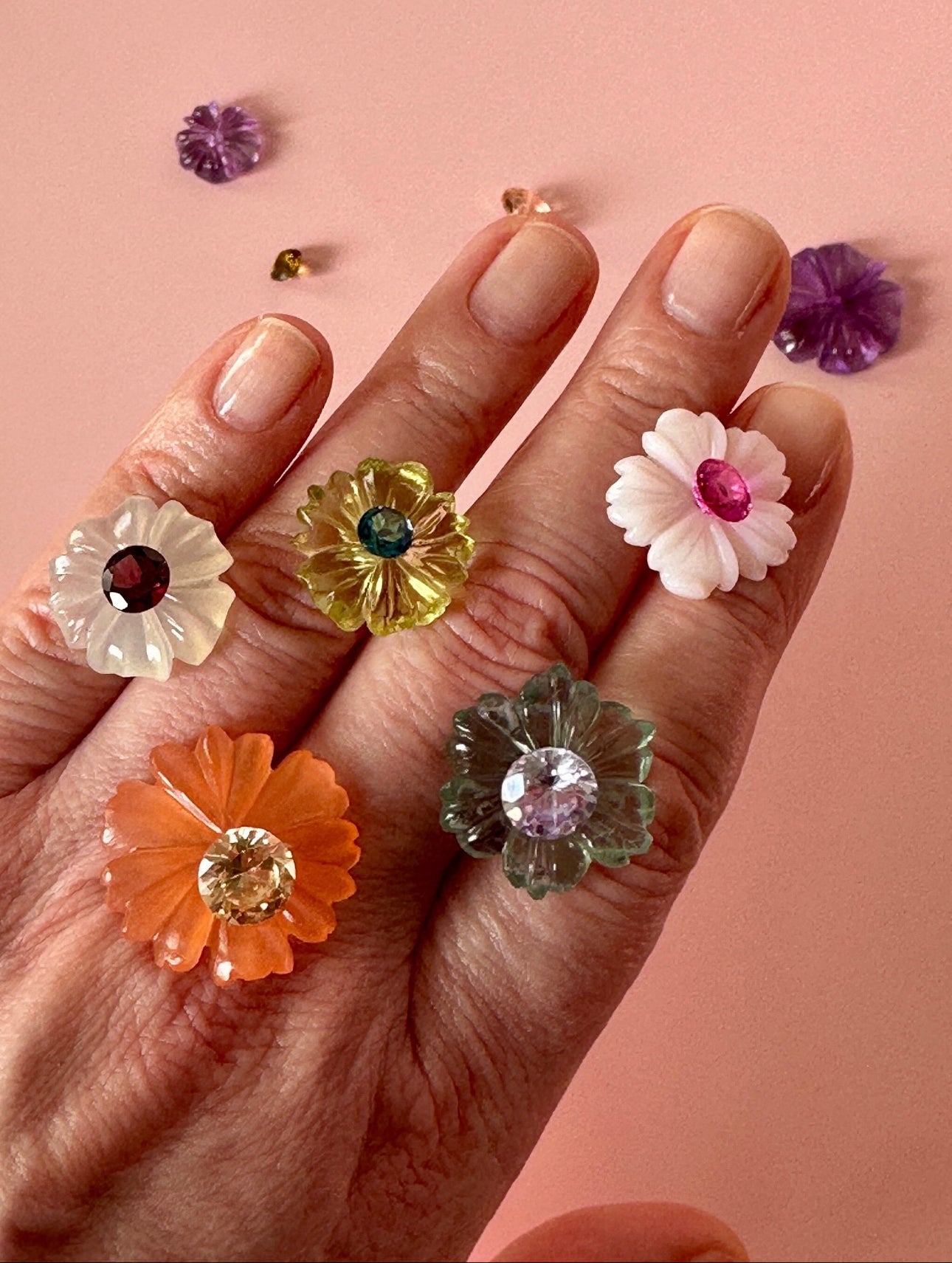 Nature’s delicate artistry carved in green fluorite embellished with lilav zircon!