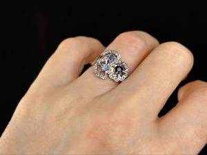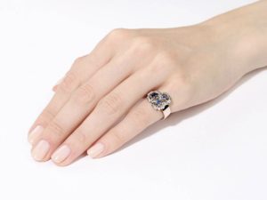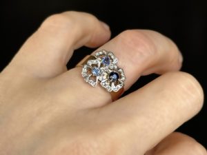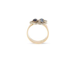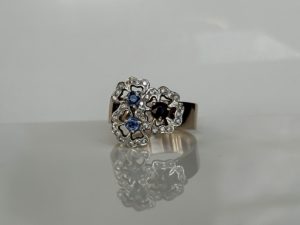 This feminine, lyrical and elegantly understated ring is a modern days heirloom. Floral composition with shimmering diamonds and blue sapphires nestled against 9K rose gold wide band could even be a stunning alternative to the traditional wedding band.