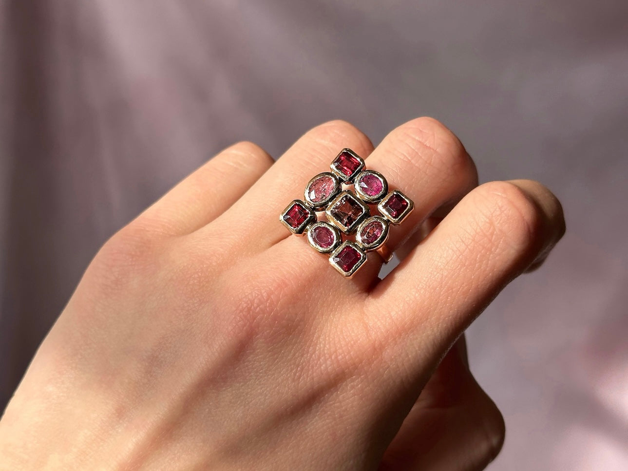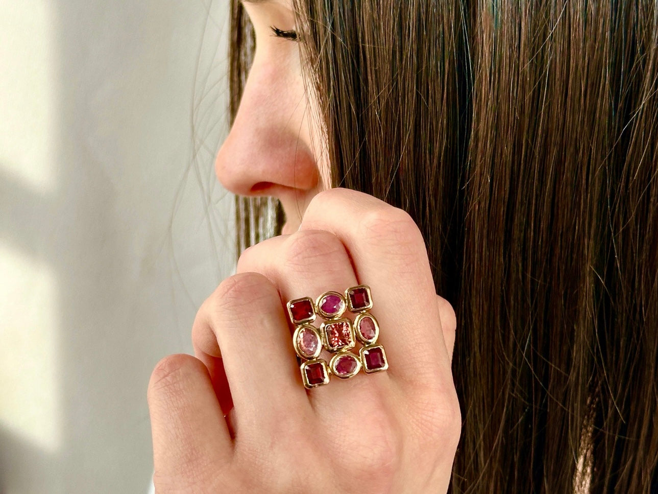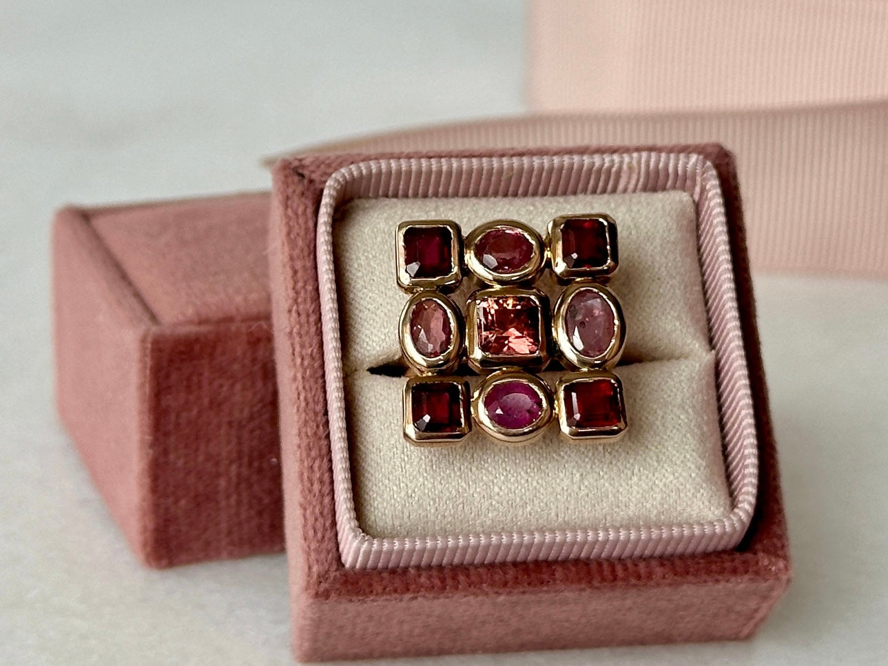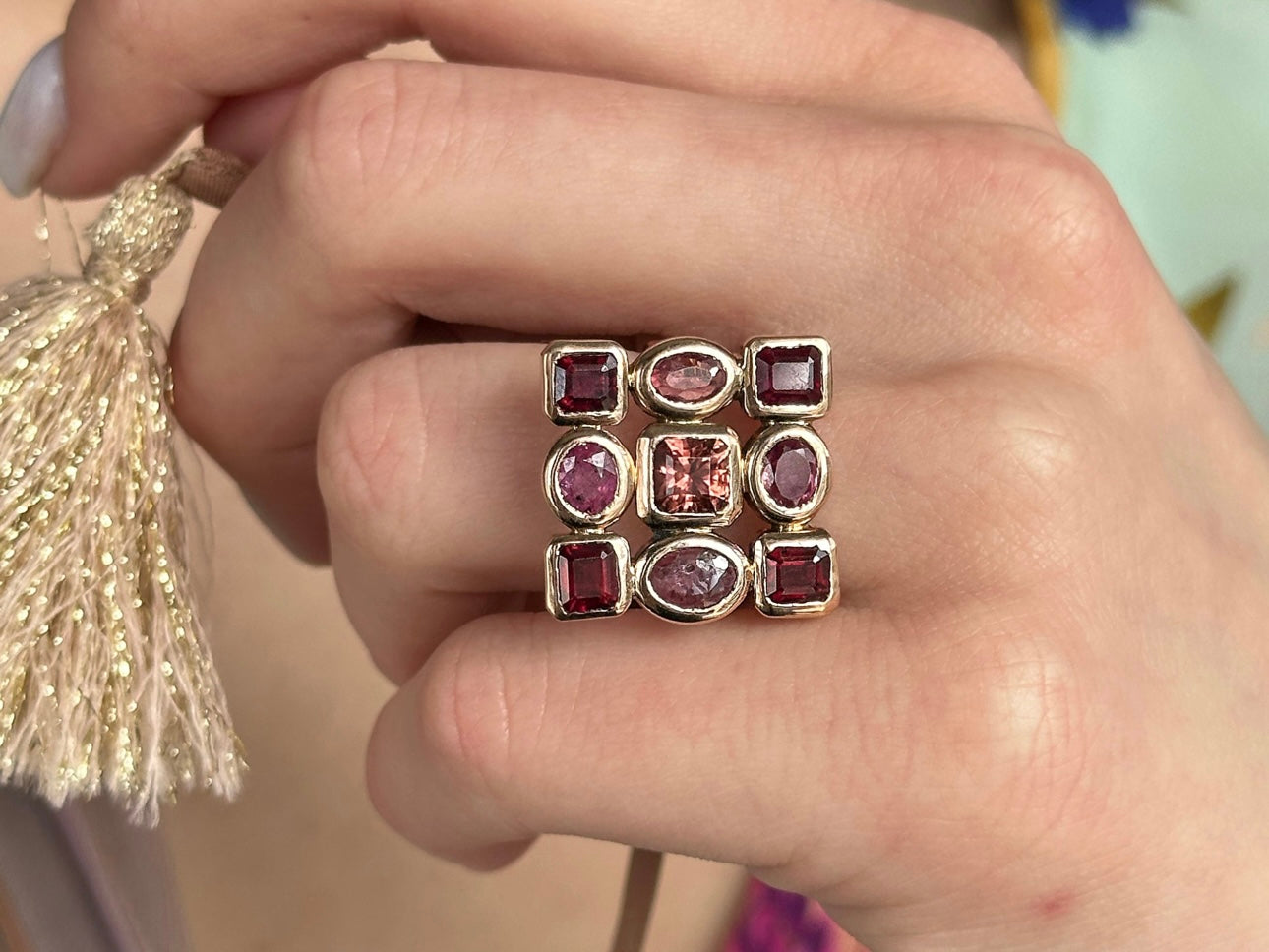 Showcasing balance of light, shape and color, this one-of-kind ring is elegant and eye-catching, yet effortless. Meticulously hand set in 9K rose gold bazels, rhodolite garnets dance around the shimmering pink tourmaline. This ring is a perfect match with any style from day to night.