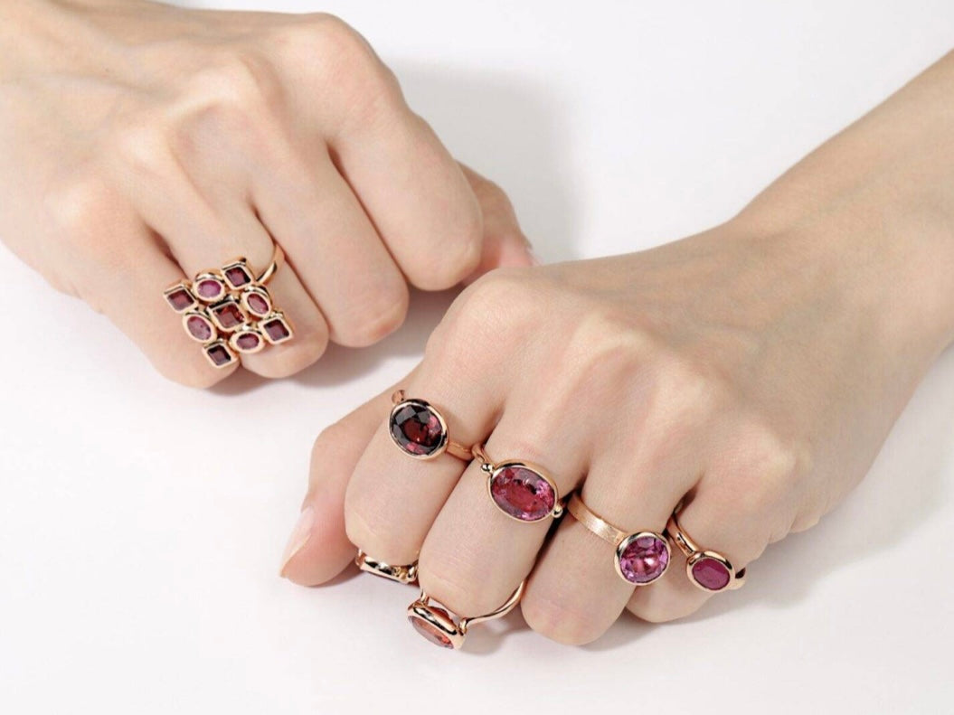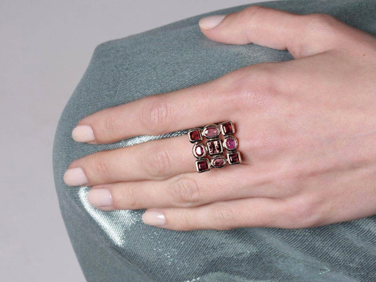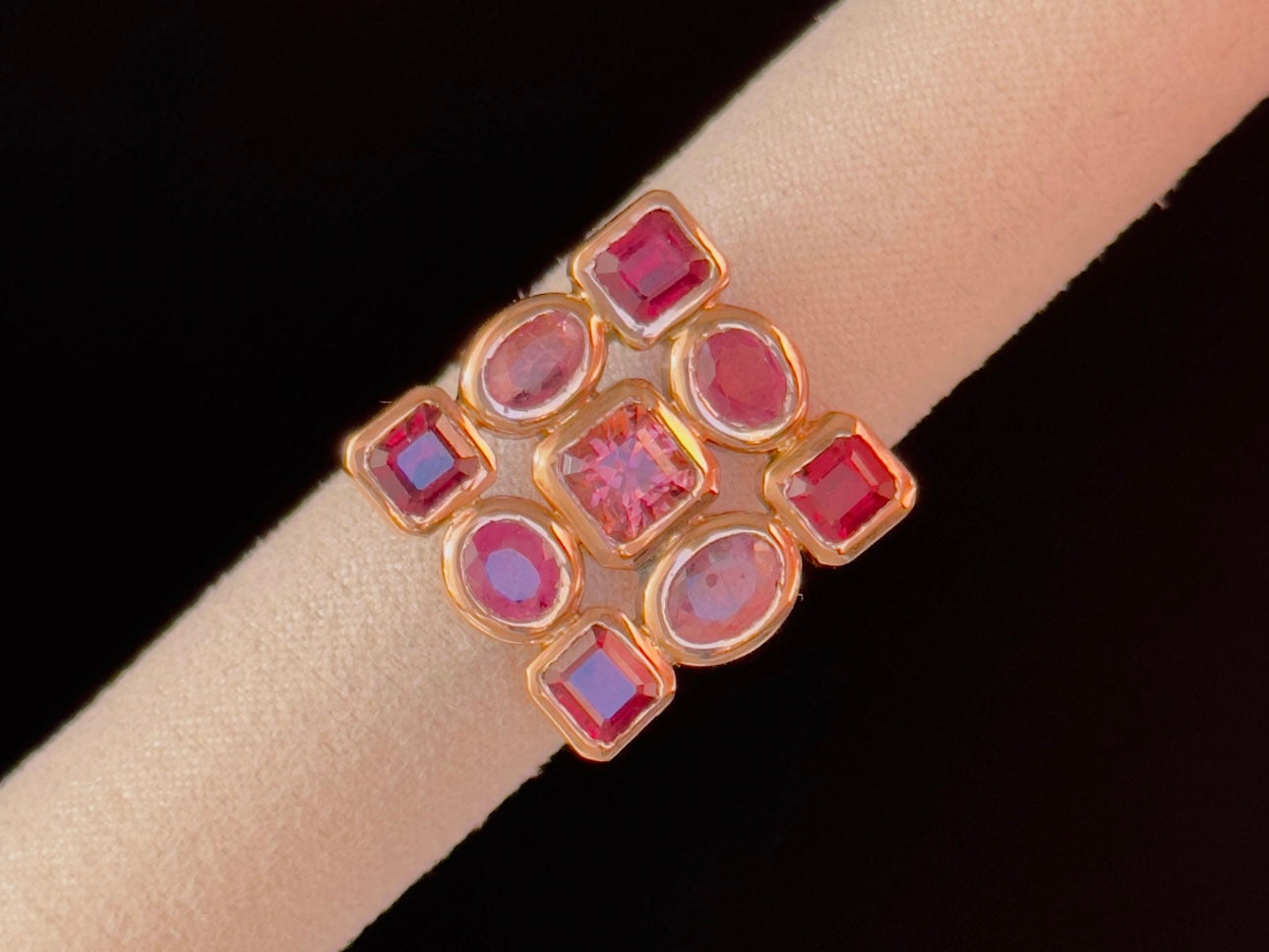 Showcasing balance of light, shape and color, this one-of-kind ring is elegant and eye-catching, yet effortless. Meticulously hand set in 9K rose gold bazels, rhodolite garnets dance around the shimmering pink tourmaline. This ring is a perfect match with any style from day to night.
