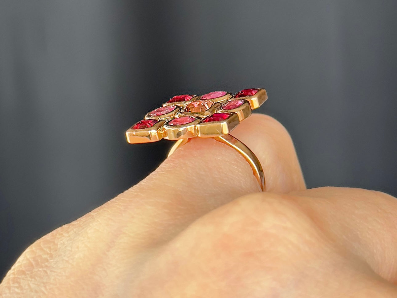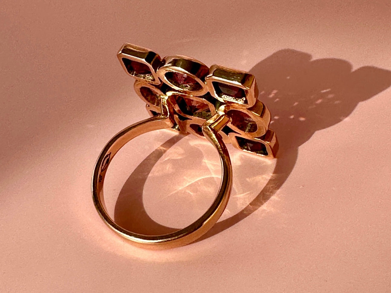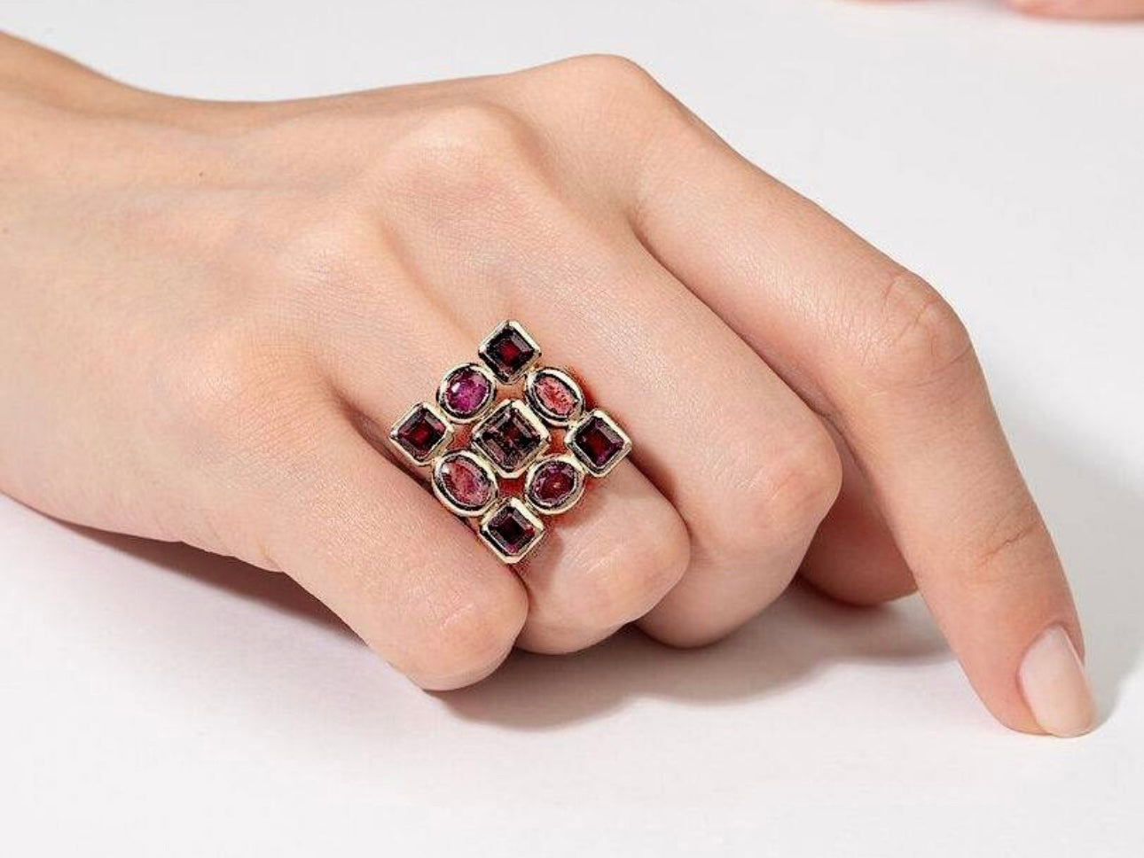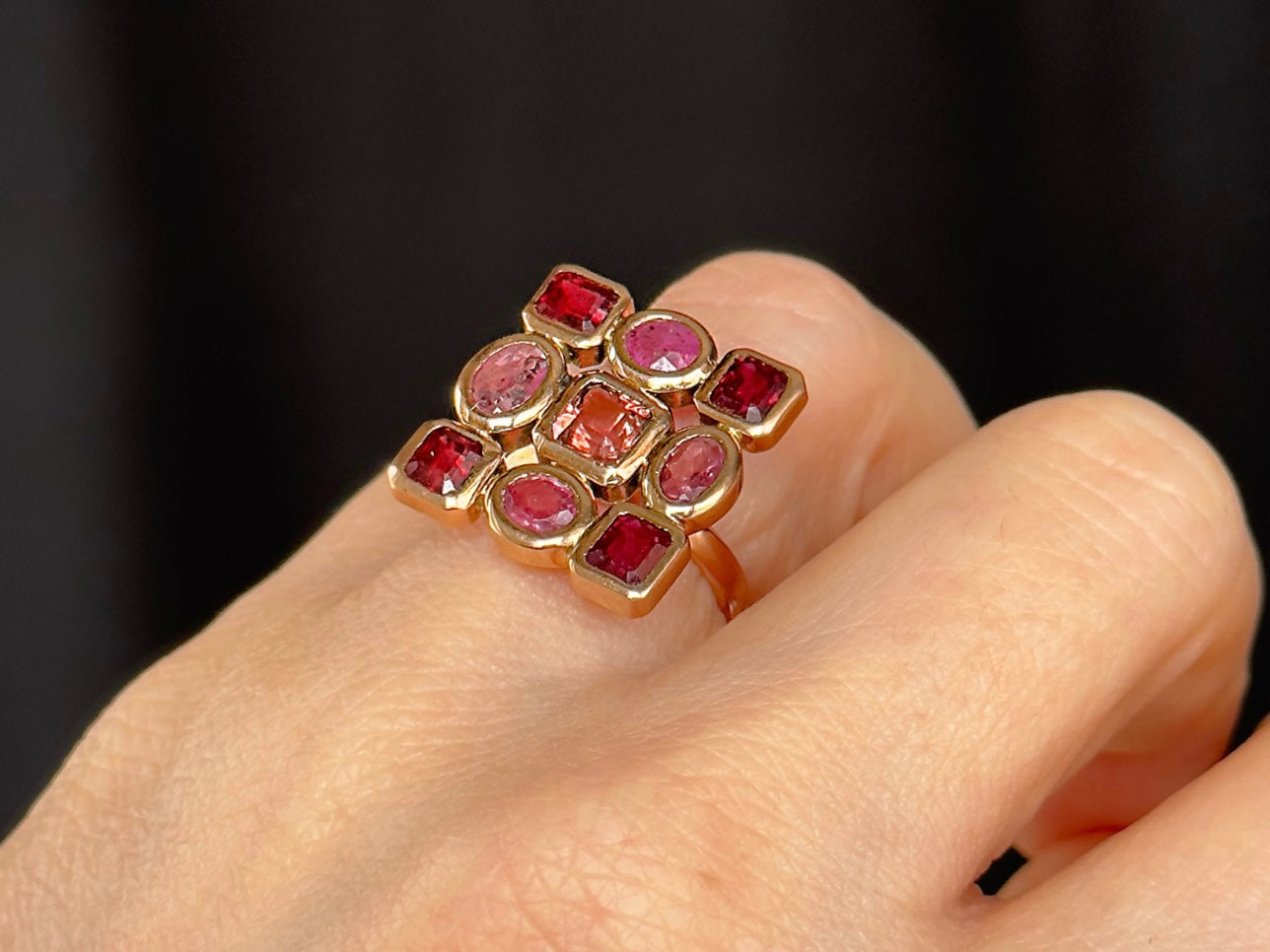 Showcasing balance of light, shape and color, this one-of-kind ring is elegant and eye-catching, yet effortless. Meticulously hand set in 9K rose gold bazels, rhodolite garnets dance around the shimmering pink tourmaline. This ring is a perfect match with any style from day to night.