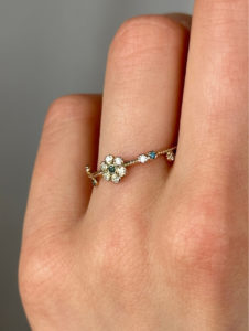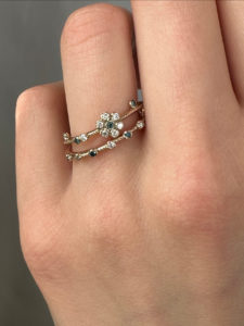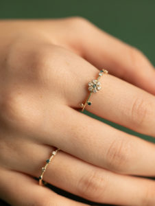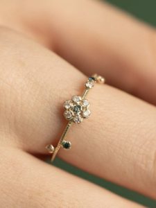 Handcrafted to perfection, featuring timeless design this flower cluster ring is adorned with brilliant white diamonds and fancy green diamonds set in our signature rosette setting that symbolizes sweet love and romance not to mention glamour.