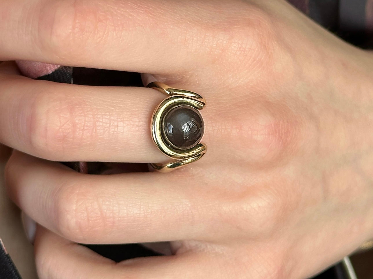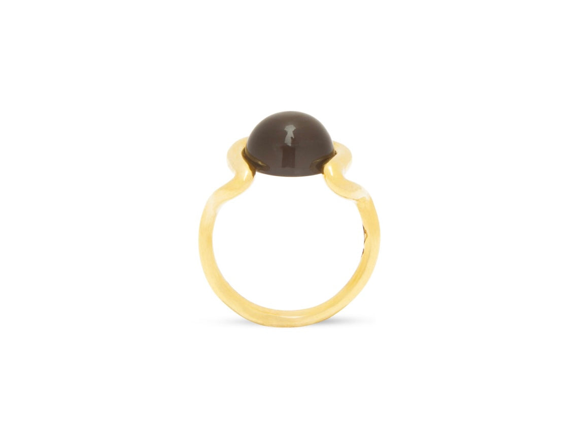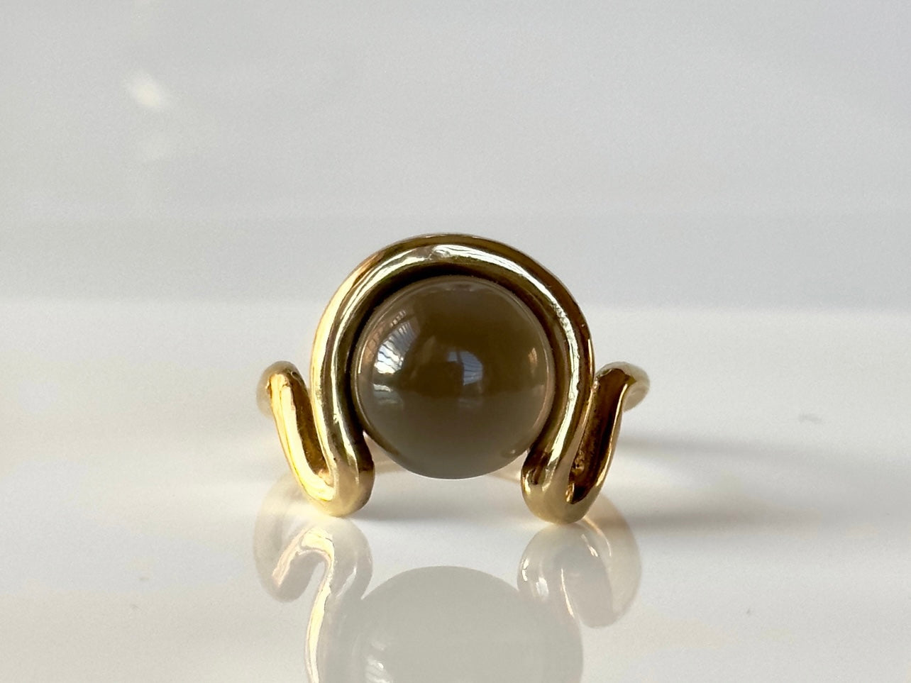Bold, modern and striking in its distinctive design and craftsmanship, this earthy grey moonstone round cabochon ring is a contemporary alternative to the traditional cocktail ring. Slip this ring on your finger when you need a bold, statement-making piece of jewelry.