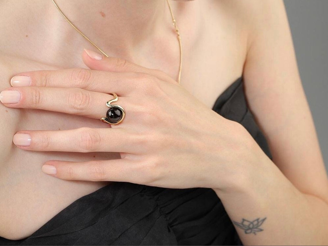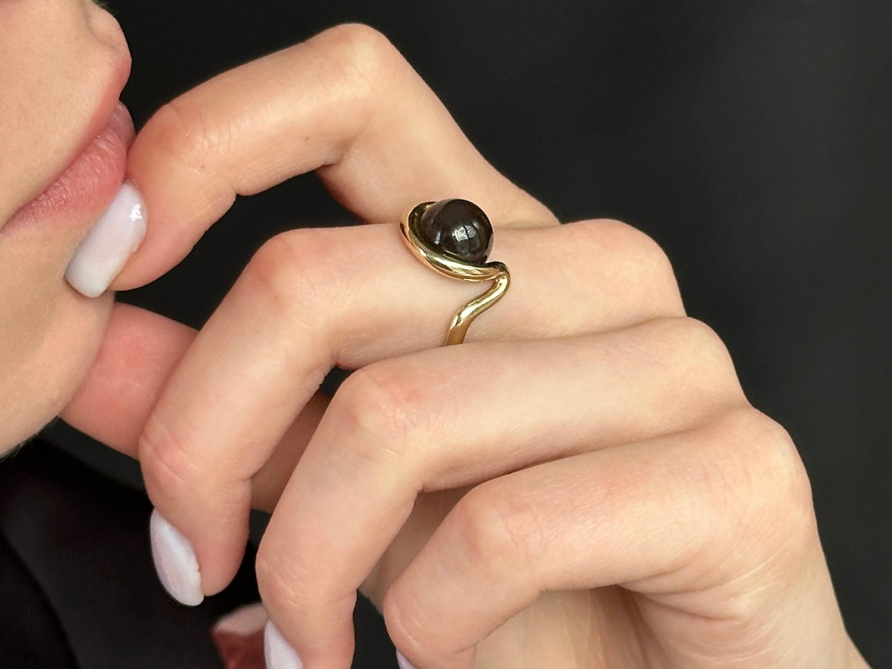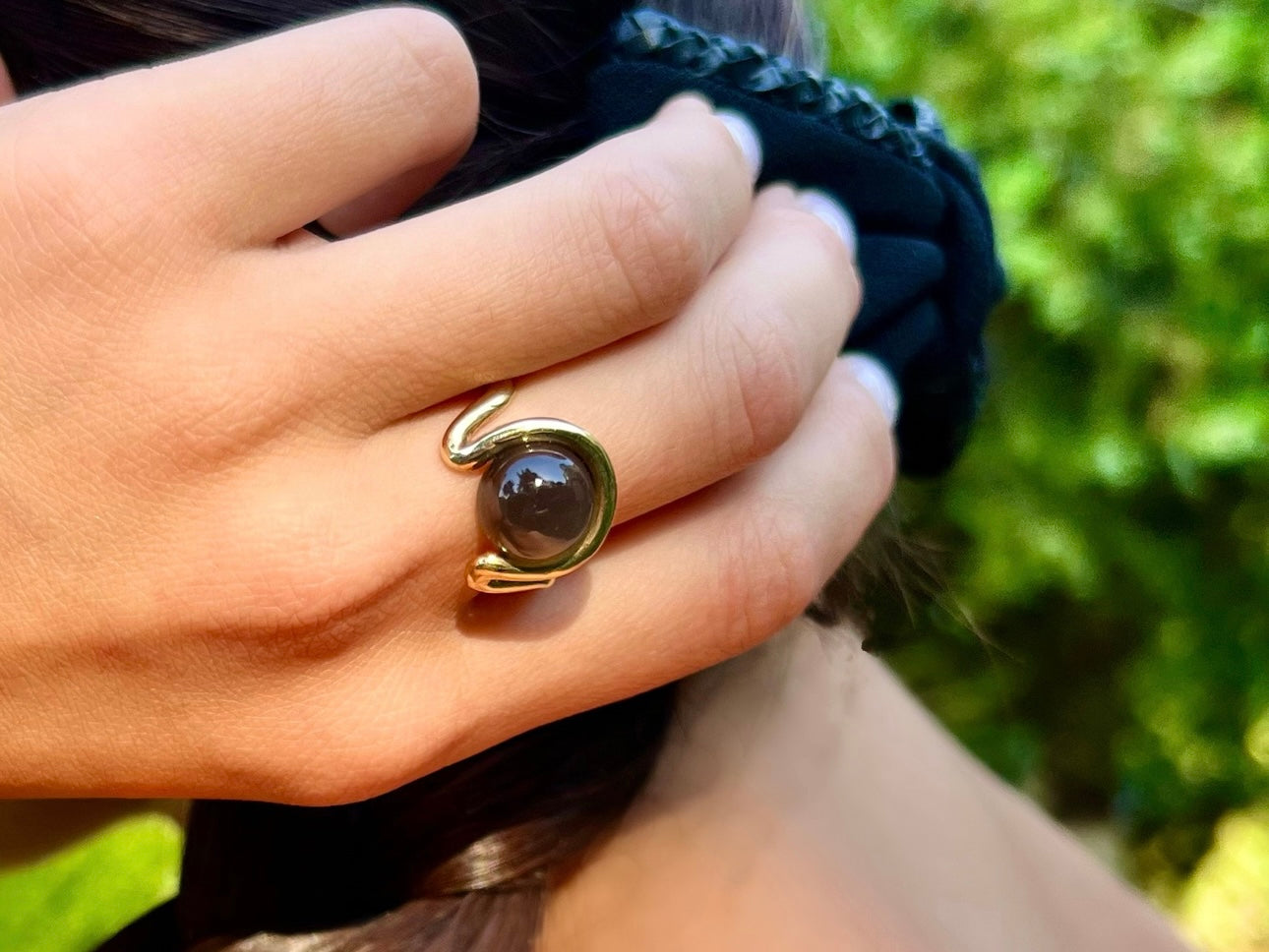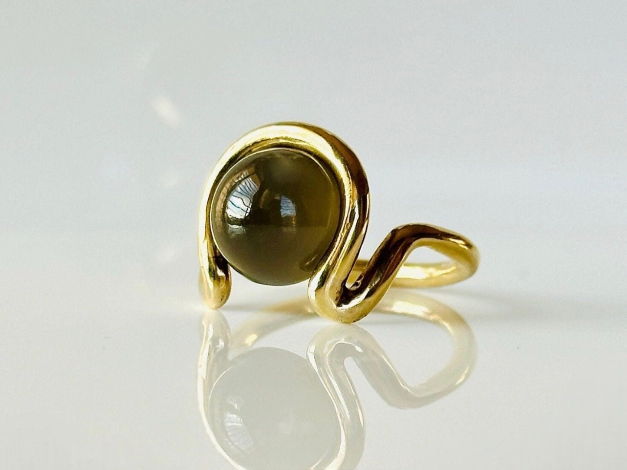 Bold, modern and striking in its distinctive design and craftsmanship, this earthy grey moonstone round cabochon ring is a contemporary alternative to the traditional cocktail ring. Slip this ring on your finger when you need a bold, statement-making piece of jewelry.