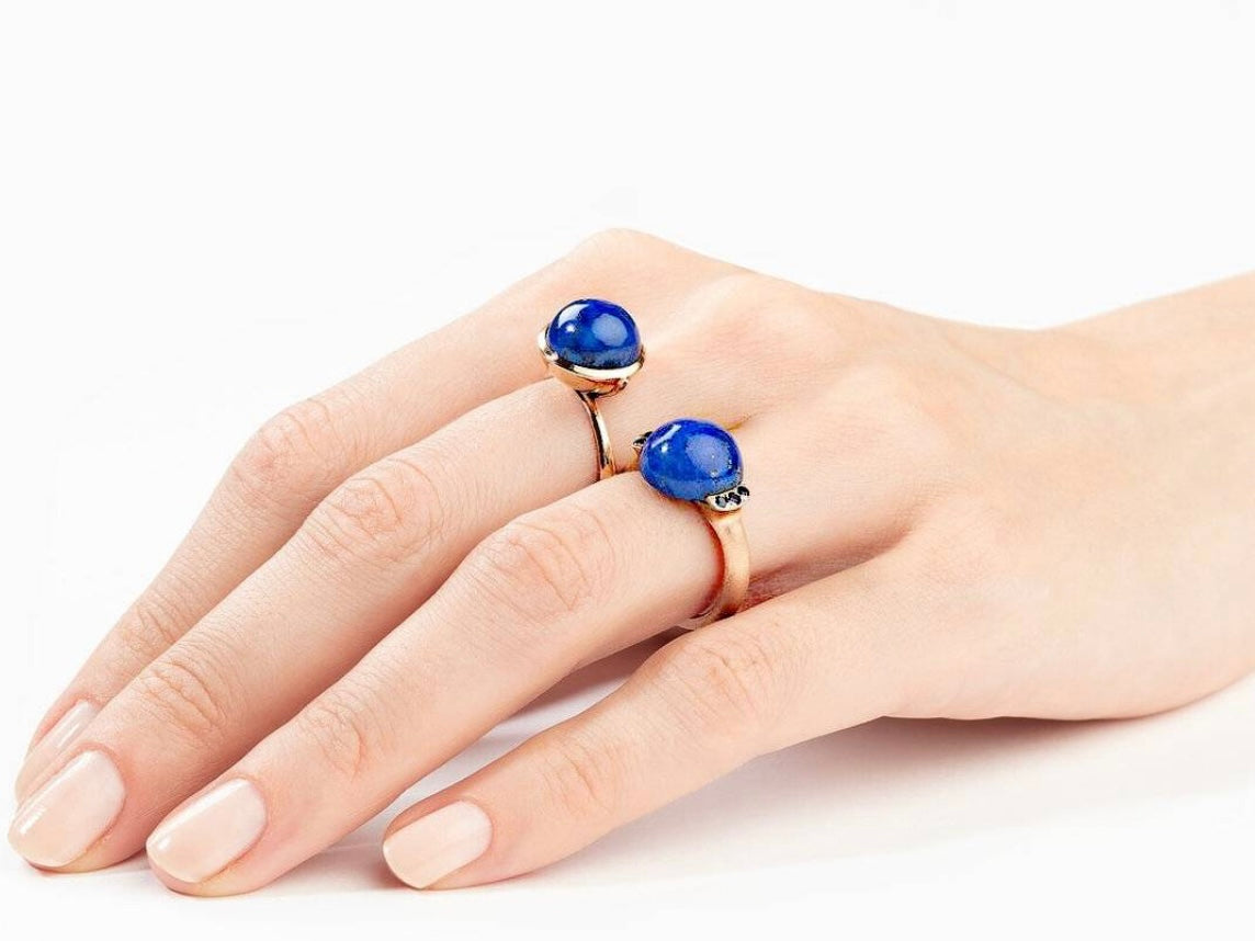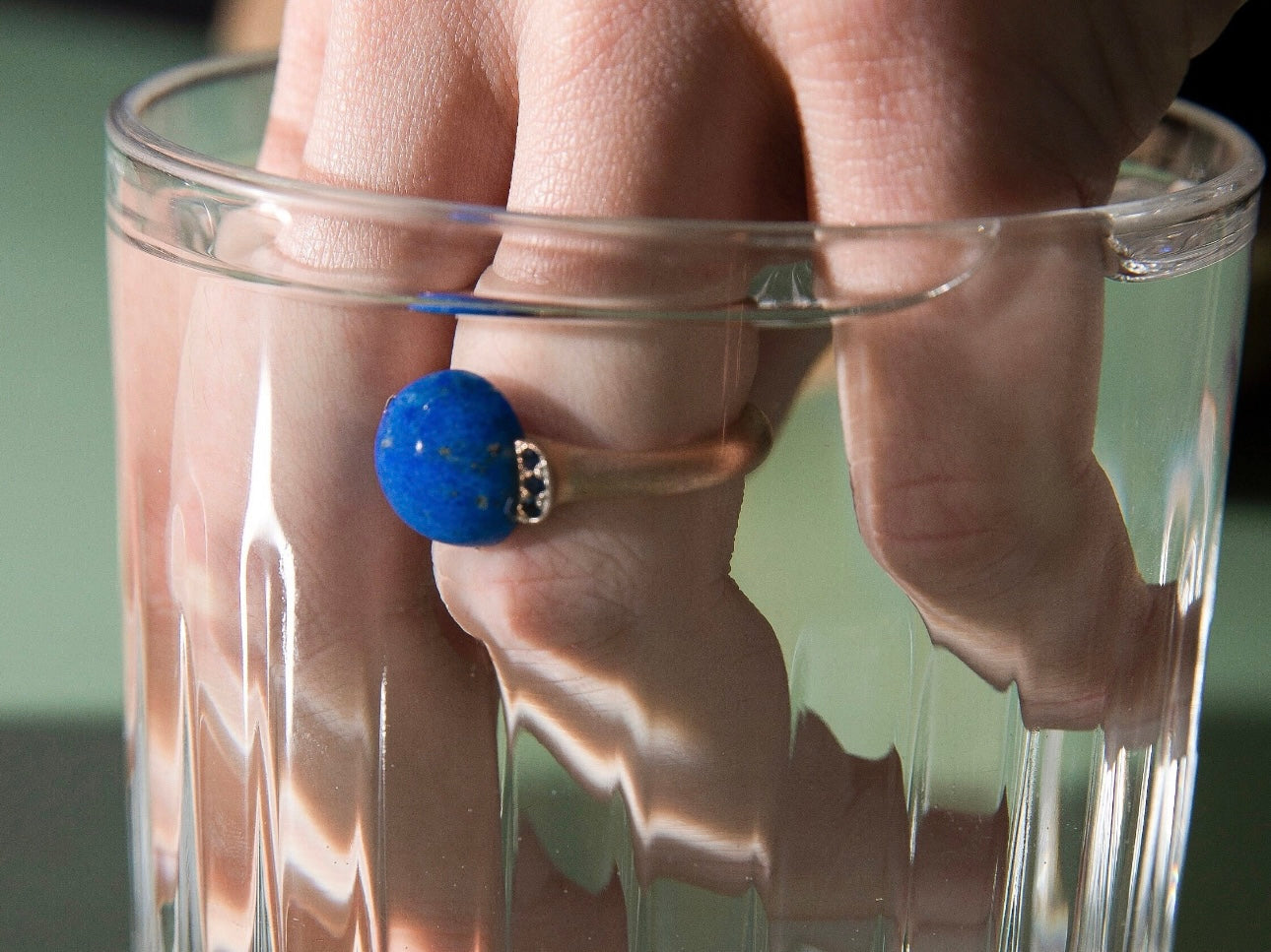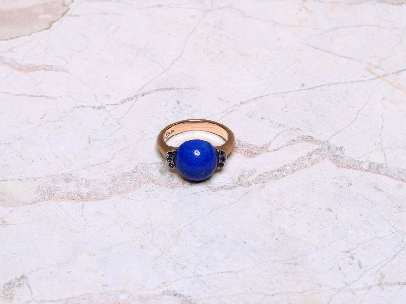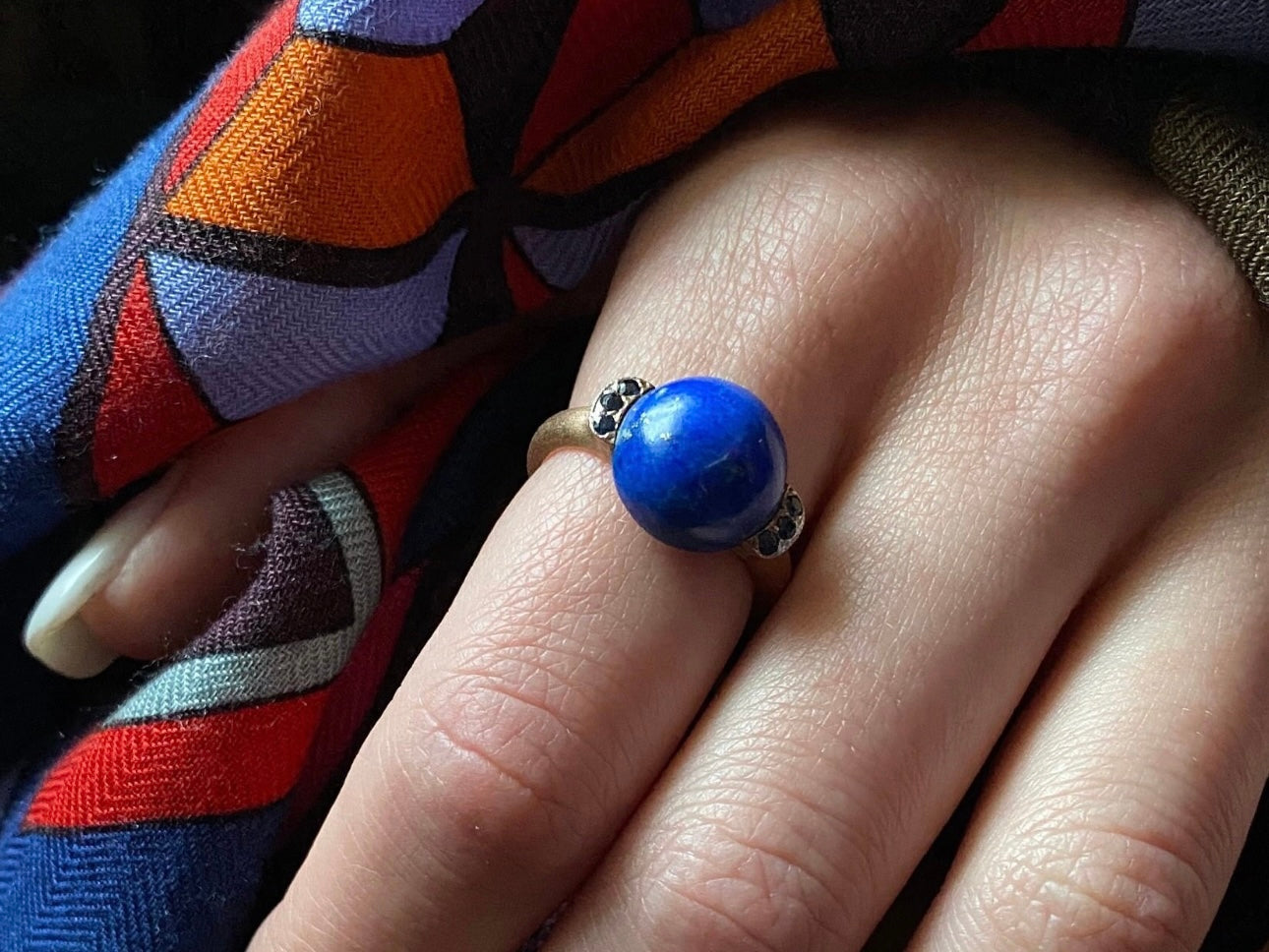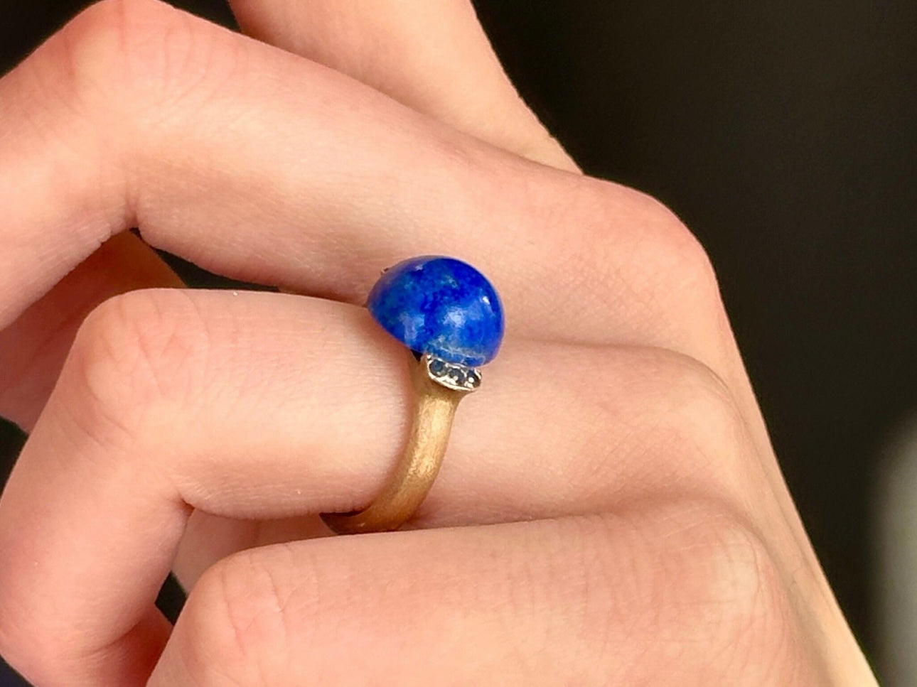 This simple yet striking ring is handmade of cobalt blue lapis lazuli cabochon and sapphires. The bold color of the stone is enhanced with clean delicate lines, accented with blue sapphires. Stunning in its straightforward design, this ring adds a pop of color to your life.
