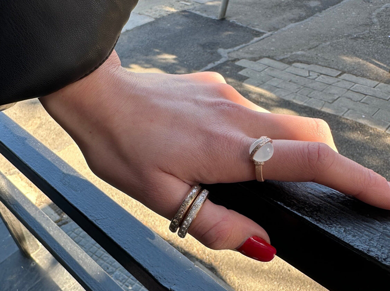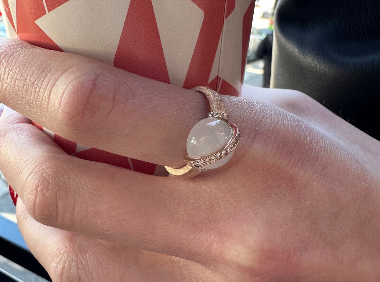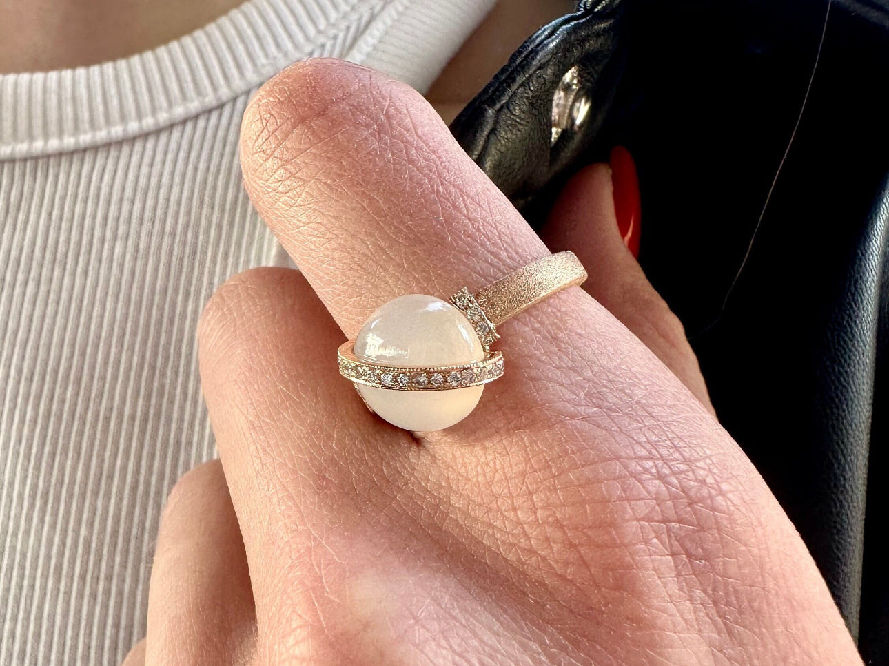 This striking ring is handmade of subtle milky moonstone and natural diamonds. The moonstone is enhanced with clean delicate lines, accented with brilliant diamonds.