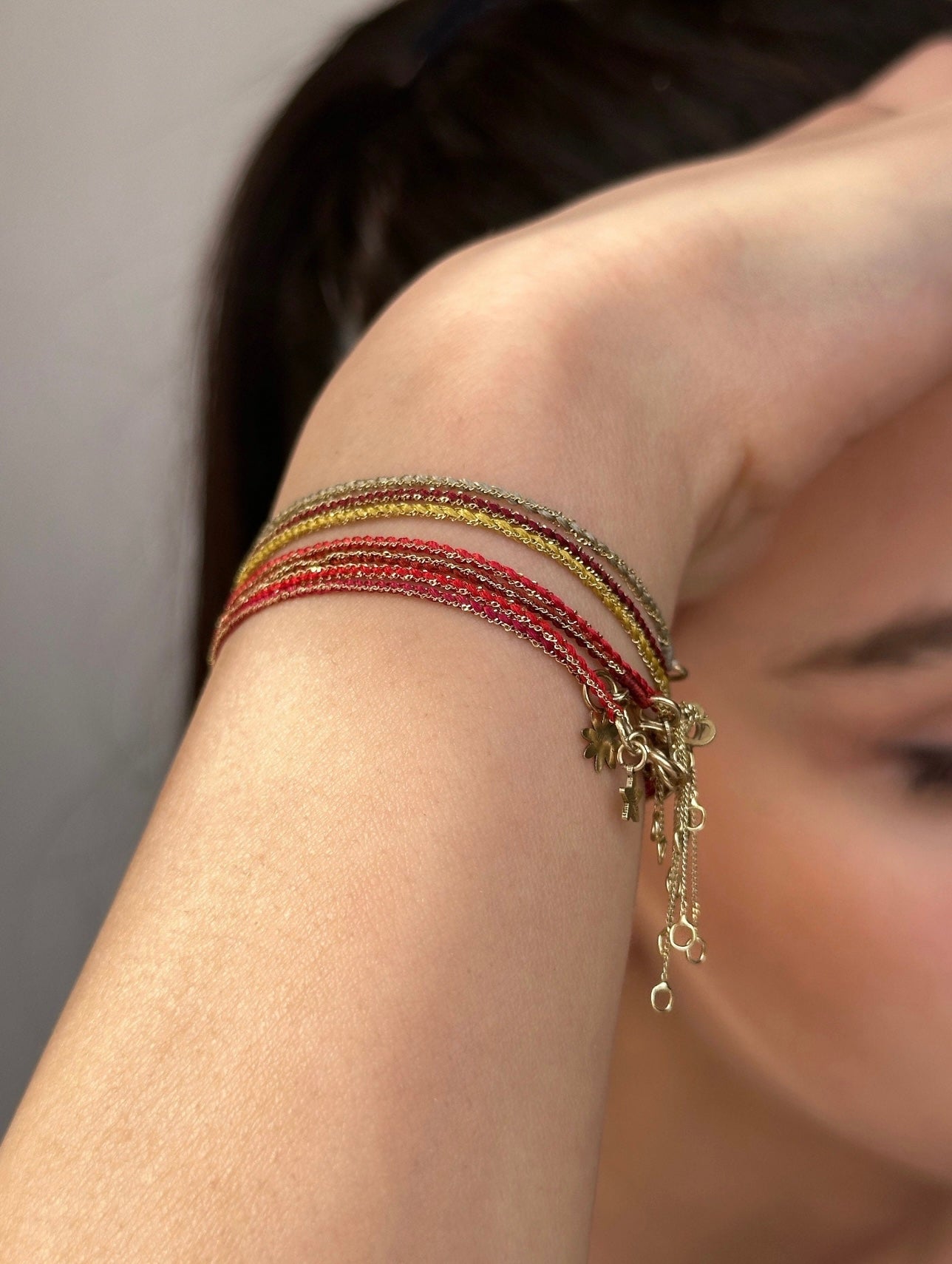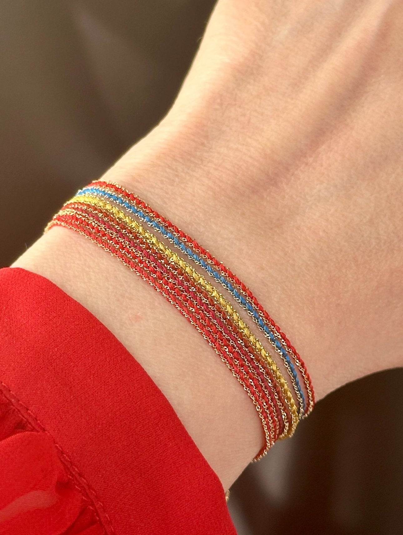 Woven from a solid gold chain and luxurious silky threads this bracelet is a perfect choice to add color, sparkle and a touch of understated luxury to any outfit.