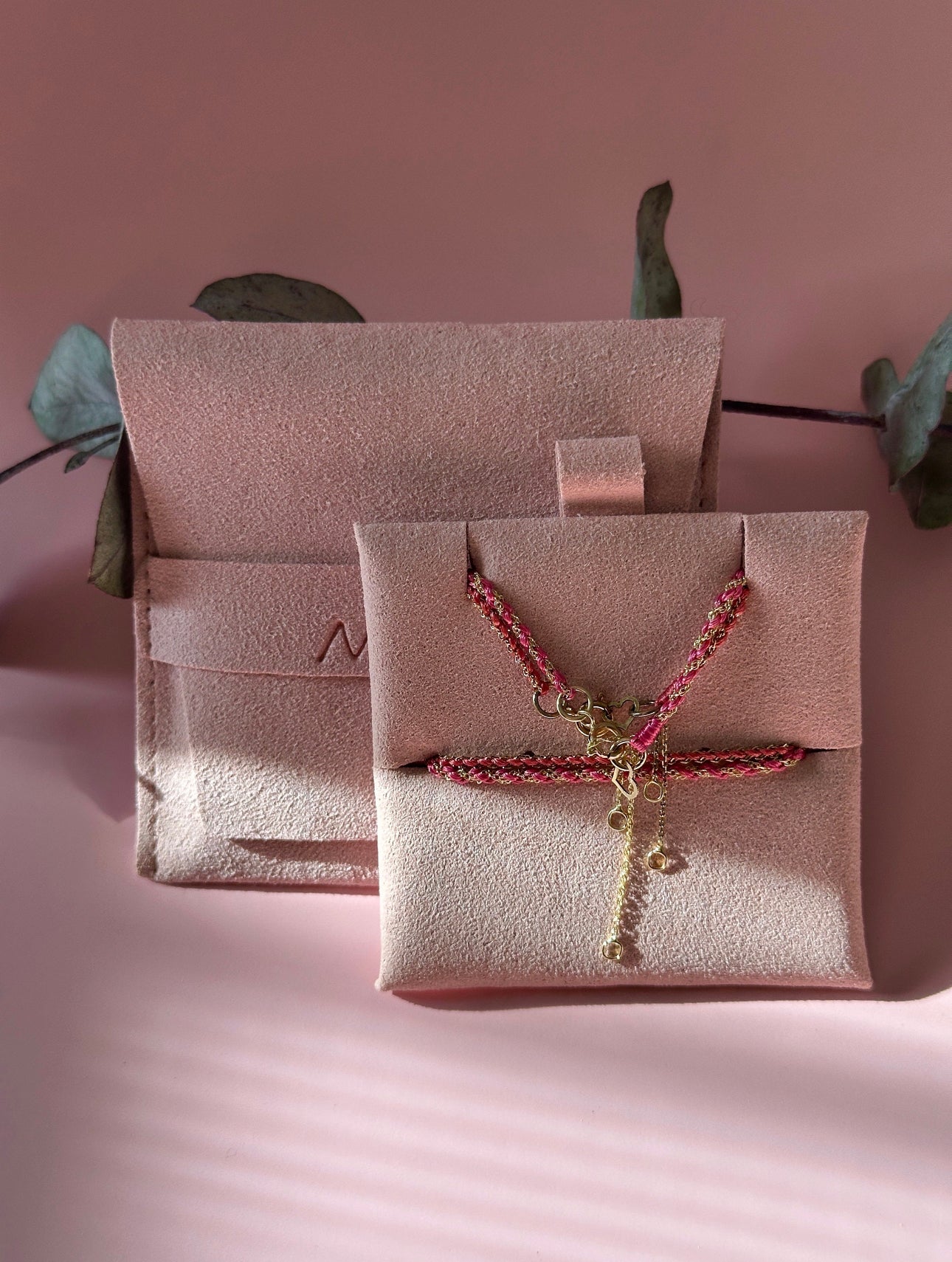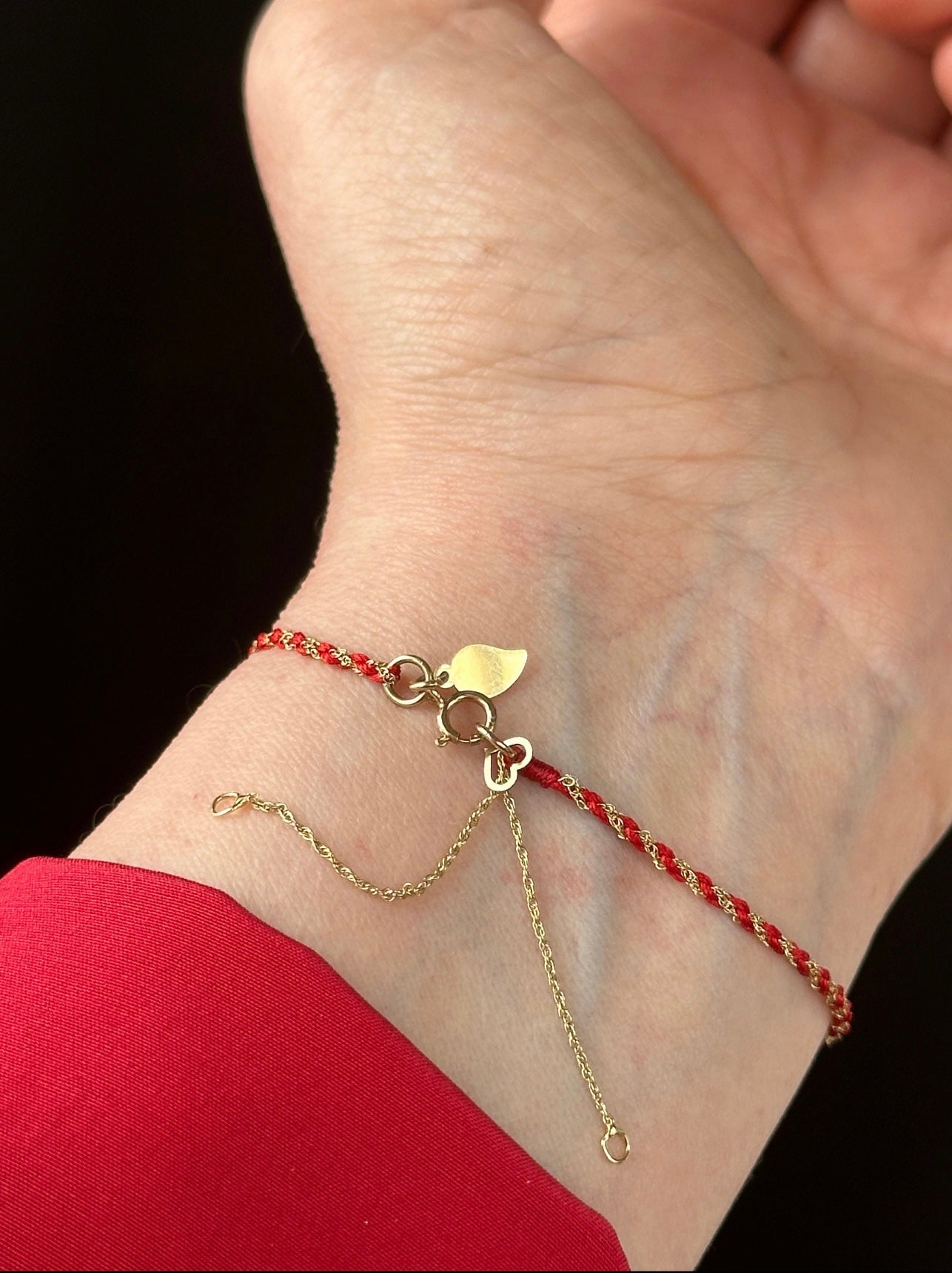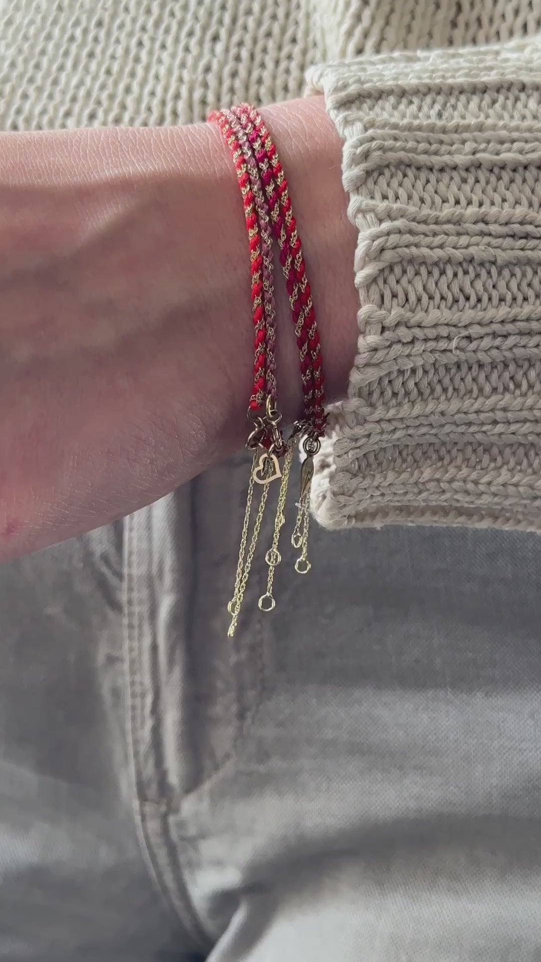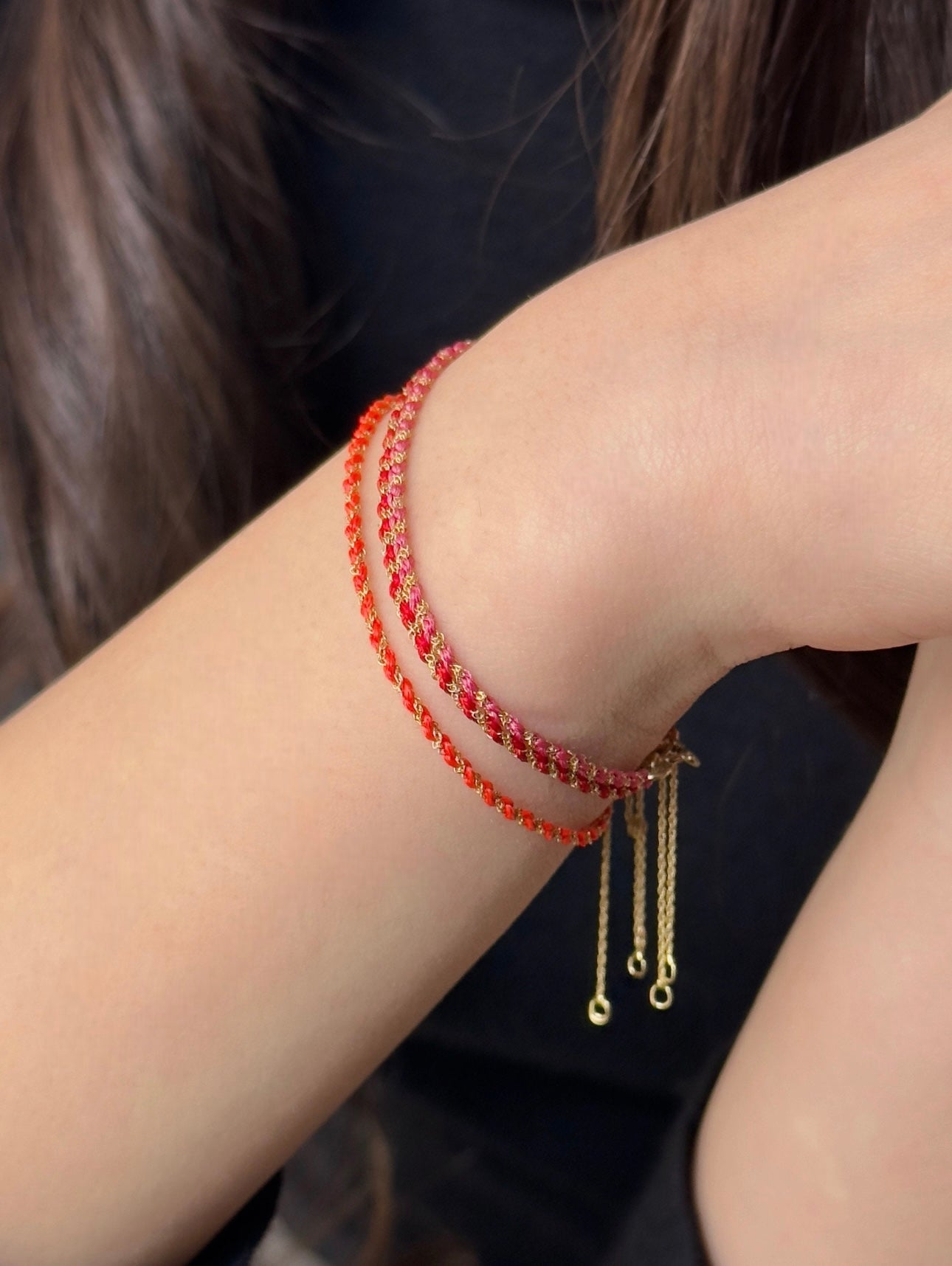 Woven from a solid gold chain and luxurious silky threads this bracelet is a perfect choice to add color, sparkle and a touch of understated luxury to any outfit.