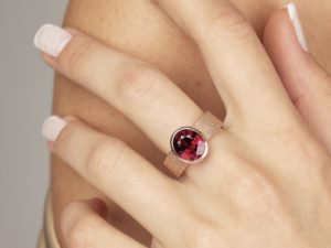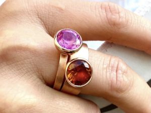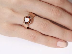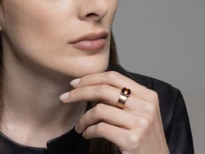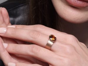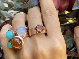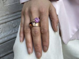 Stunning in its shimmering tone of orange this dramatic ring is a modern day heirloom and adds splash of color to any collection. Hand brushed 9k extra wide band with tapered edges feels super comfortable against the finger. The earthy rich color and understated sparkle of this ring is perfect for any attire from casual to formal.