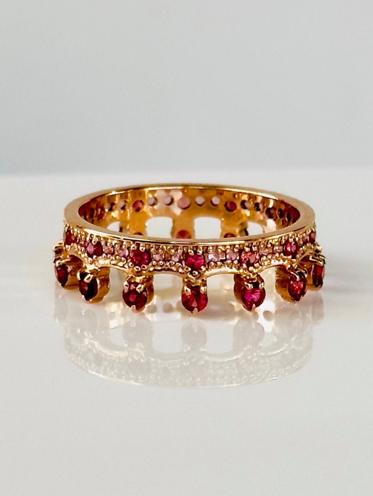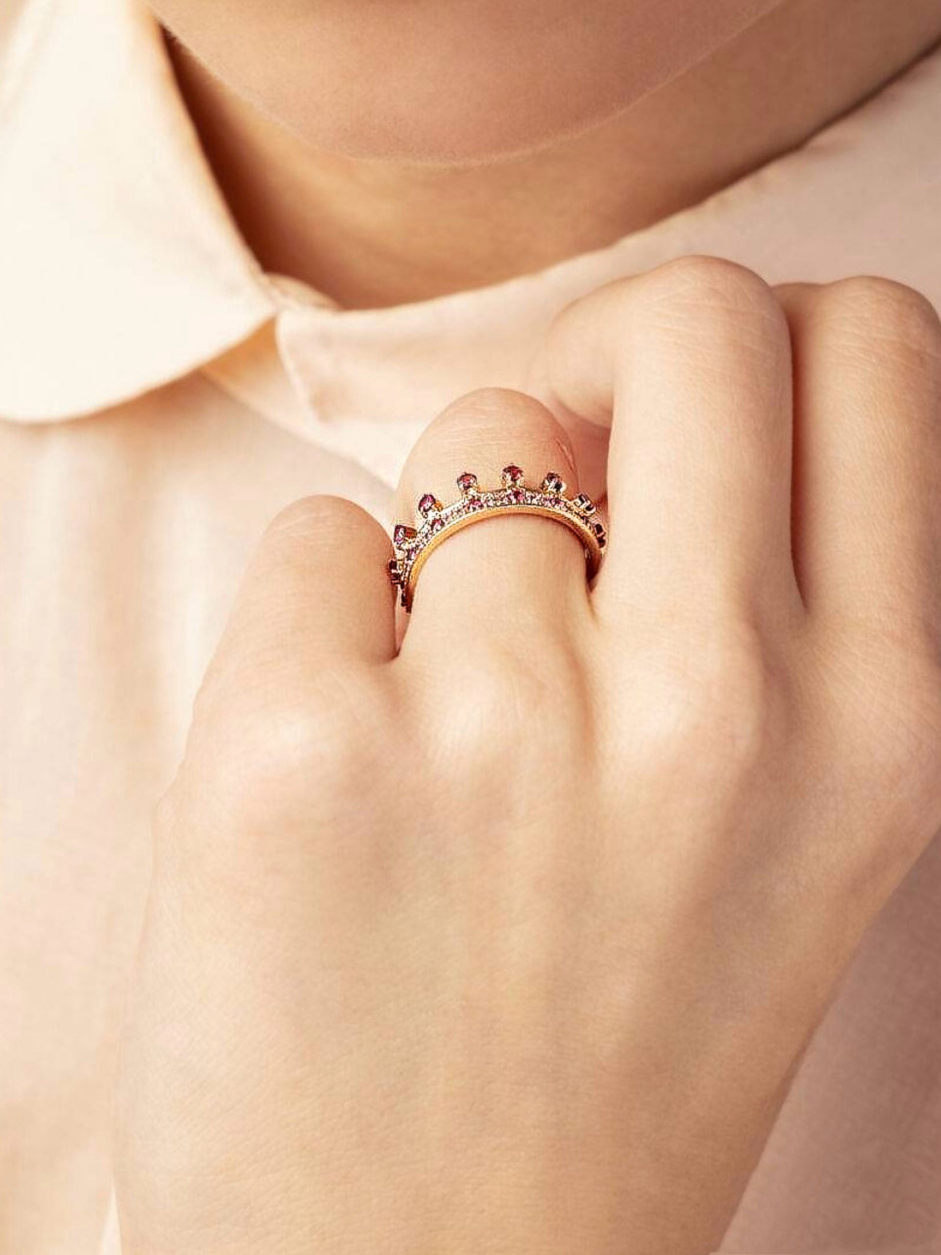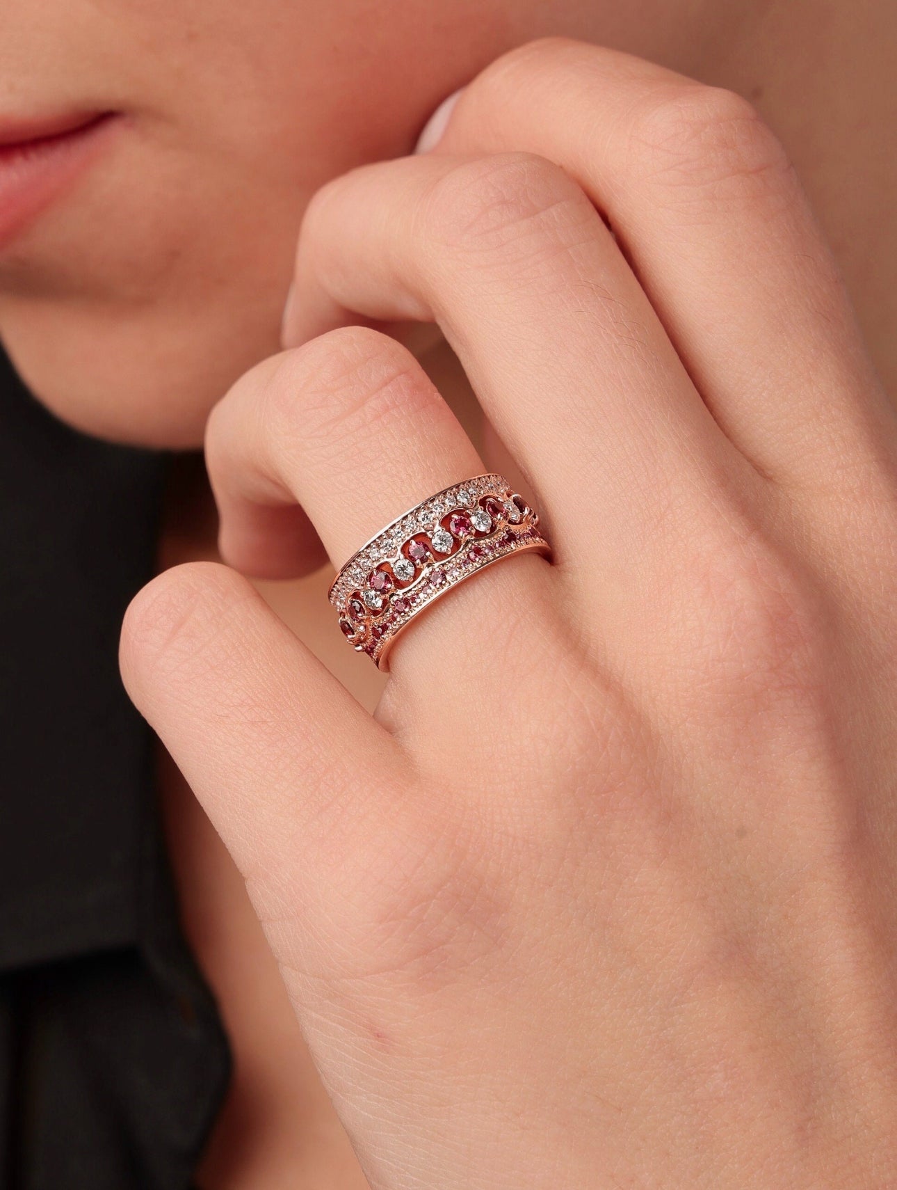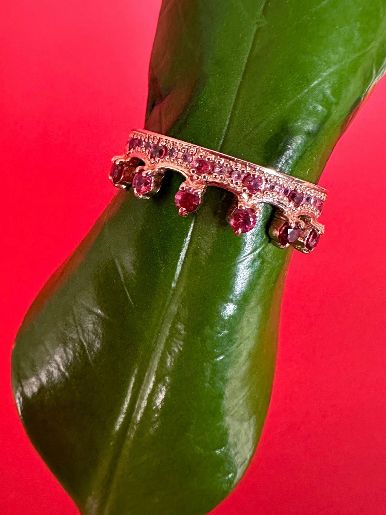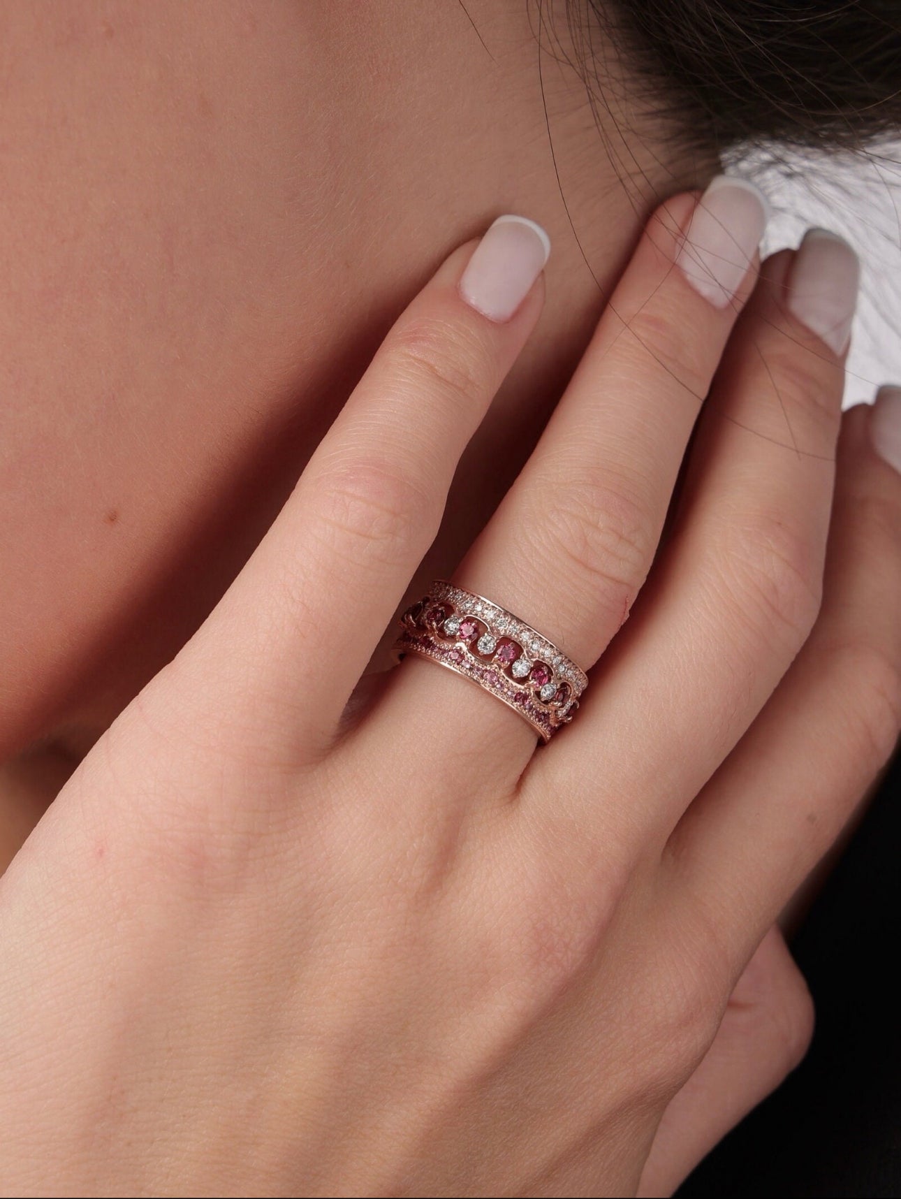 This crown ring set with sparkling pink sapphires exudes sophistication and elegance. With its timeless appeal wear it solo or stacked as a perfect alternative to a traditional wedding band or to symbolize any commitment or anniversary.
