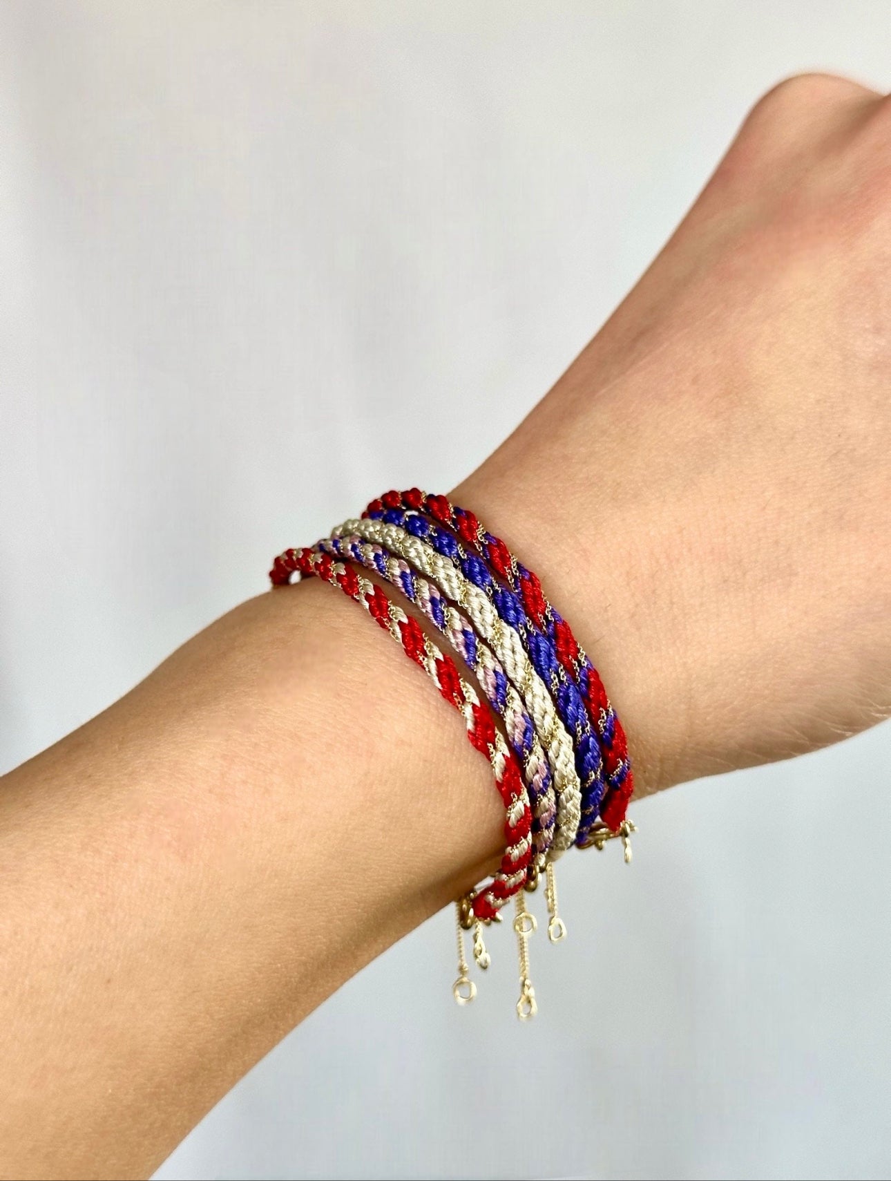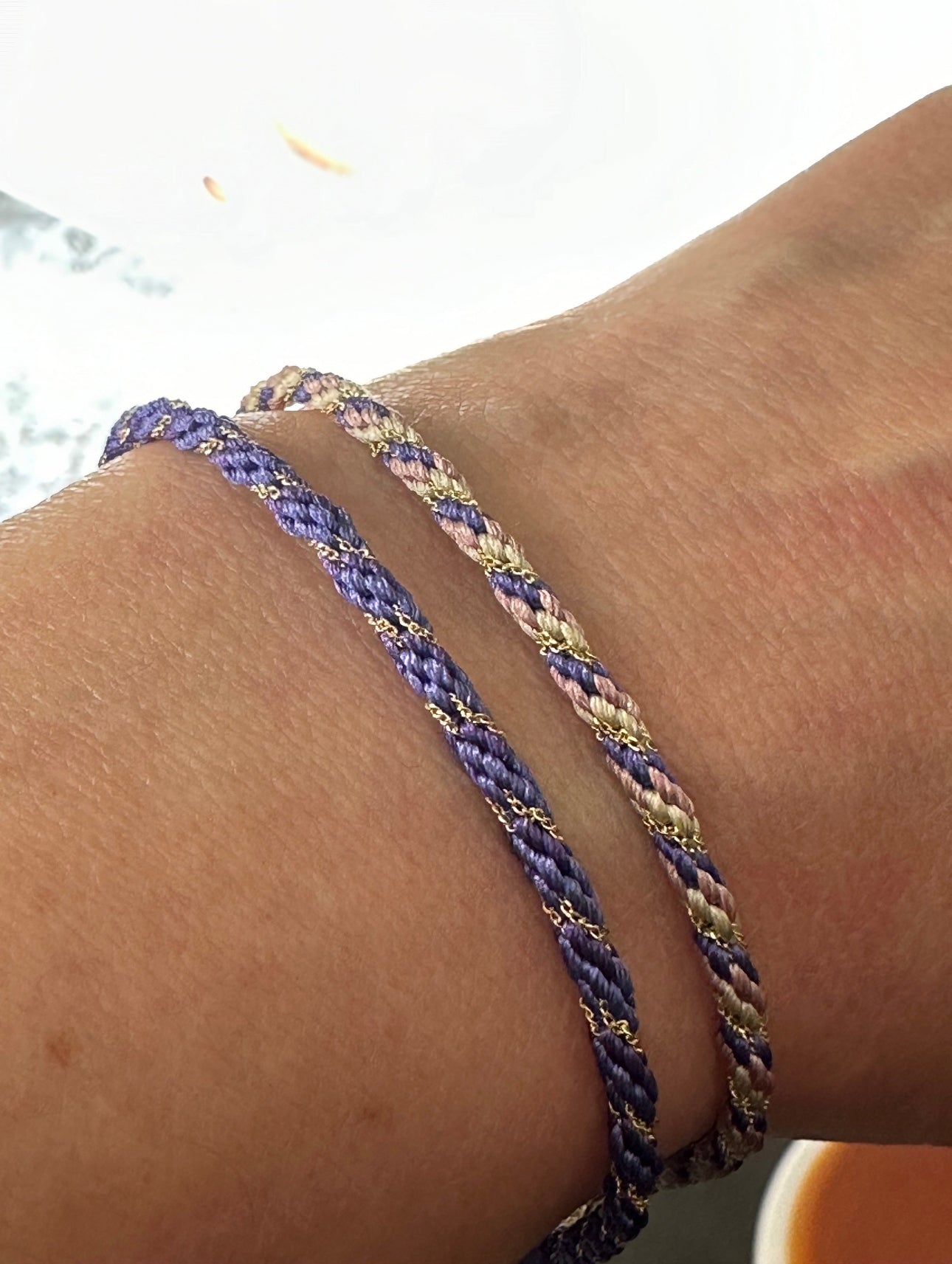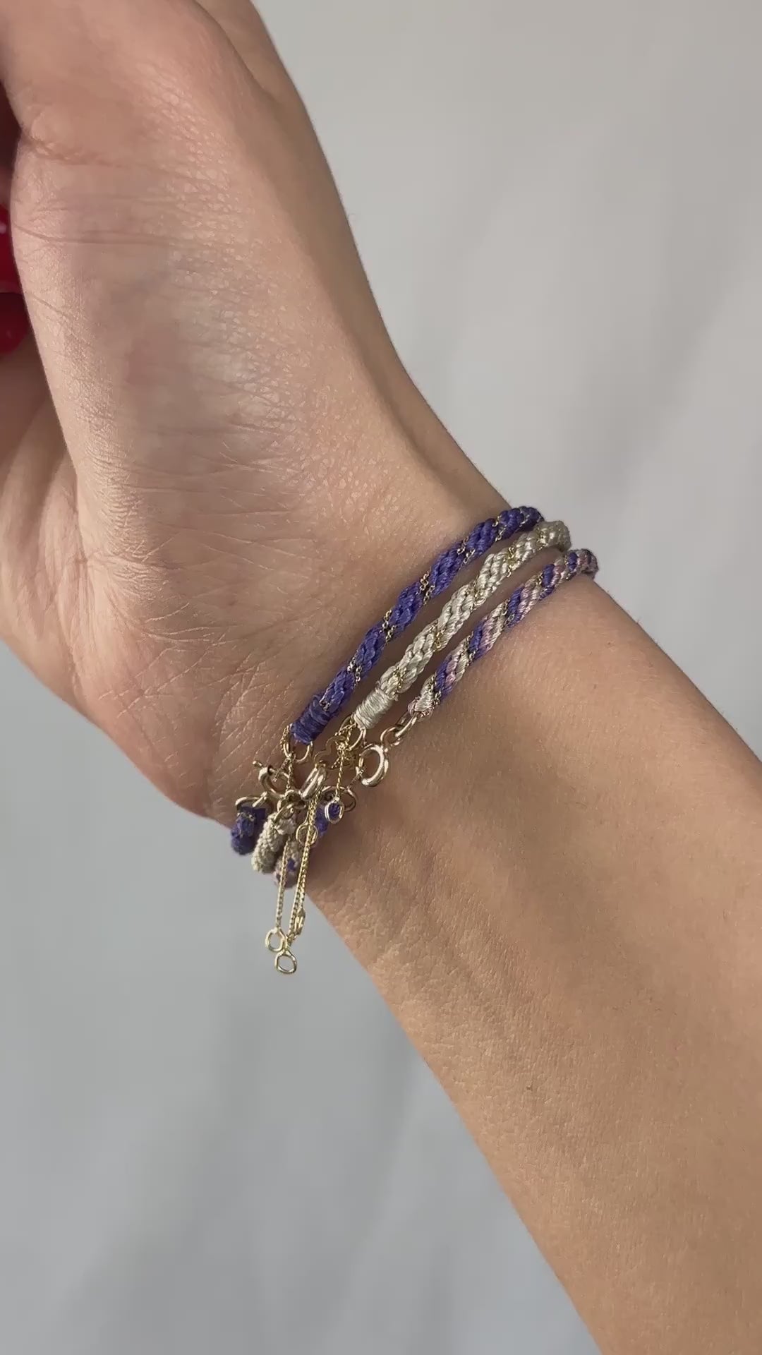 Woven from a solid gold chain and luxurious silky threads this bracelet is a perfect choice to add color, sparkle and a touch of understated luxury to any outfit.