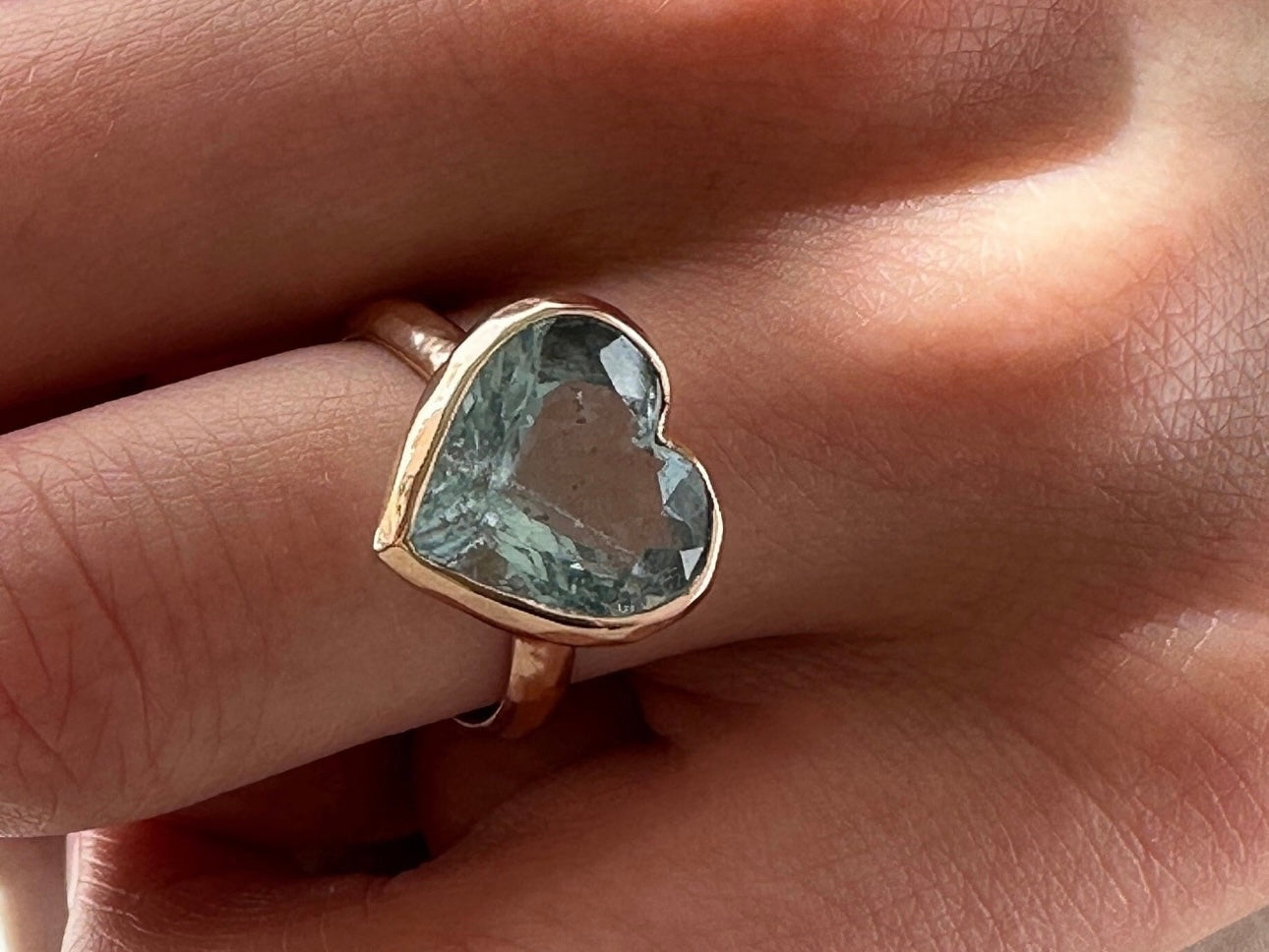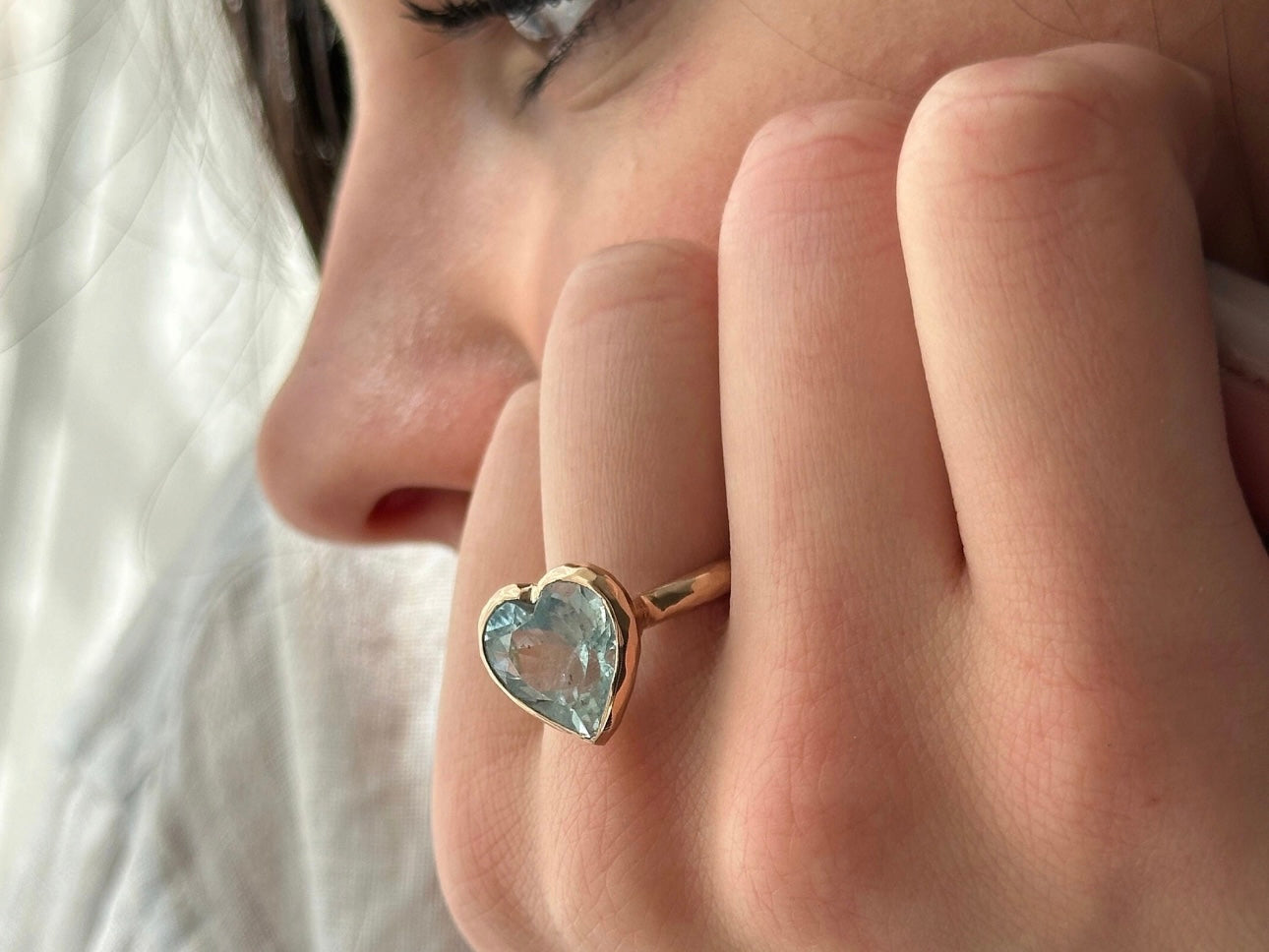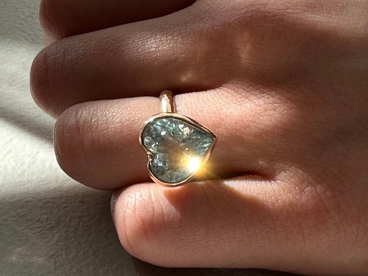 With its playful, symbolic vibe and delicate color, this ring is a perfect addition to any modern collection. 7.50ct frosted soft blue heart shaped aquamarin is encased in meticulously hand finished band. This stunning ring will make a fun alternative to a traditional cocktail ring.