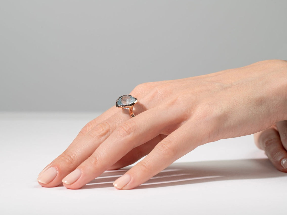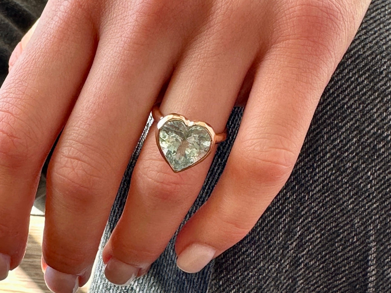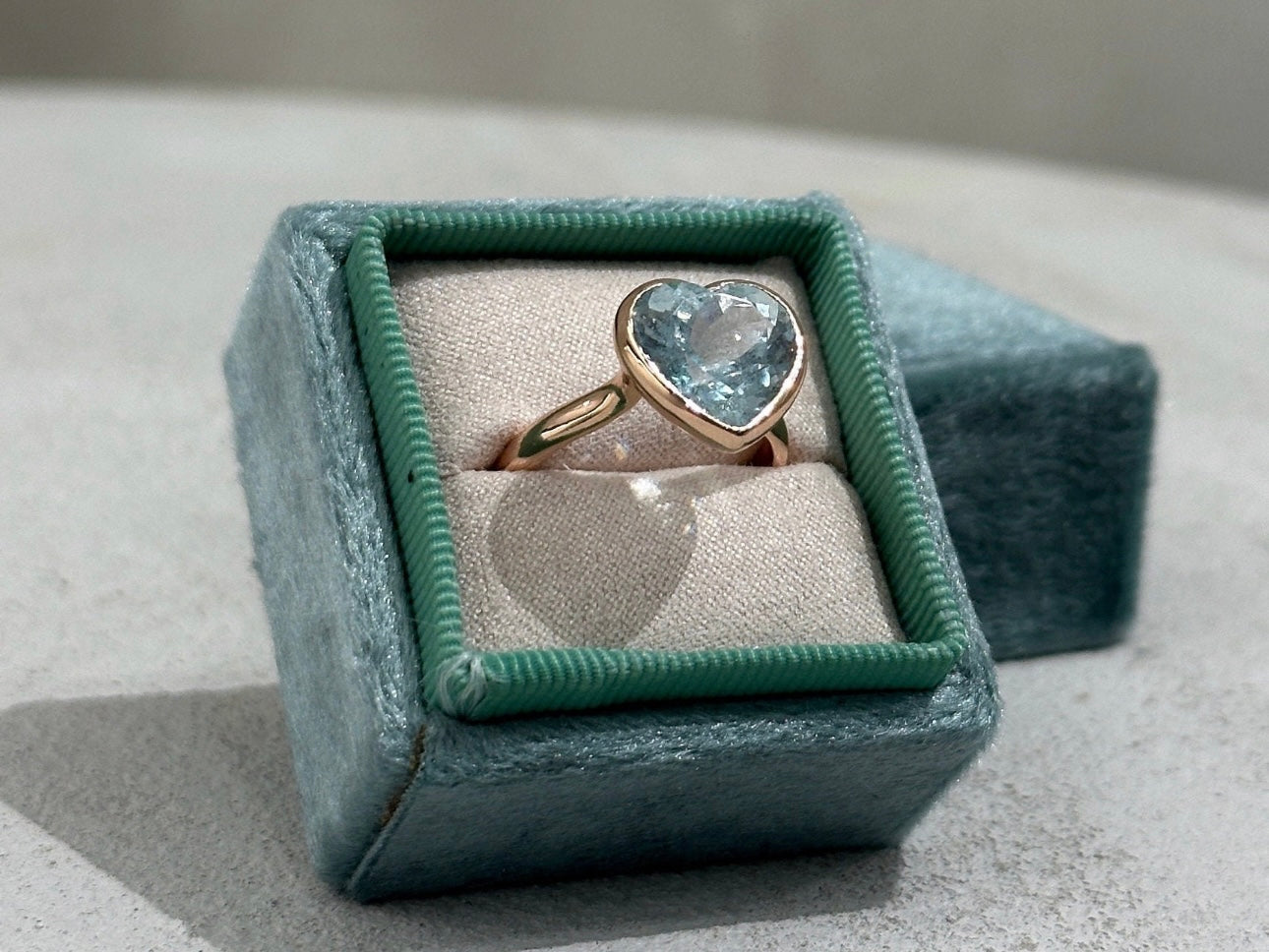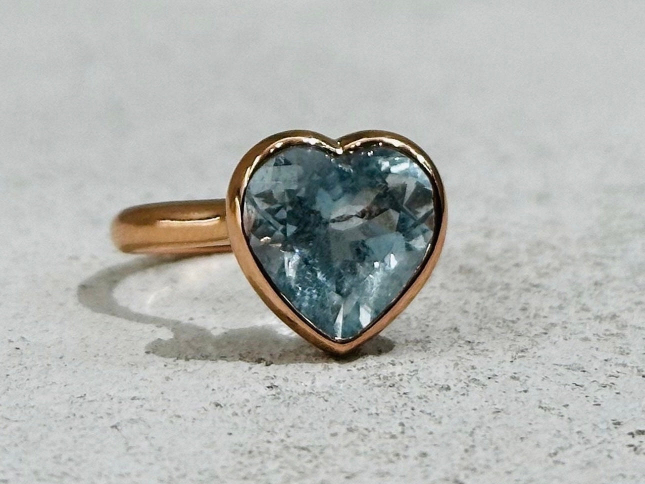 With its playful, symbolic vibe and delicate color, this ring is a perfect addition to any modern collection. 7.50ct frosted soft blue heart shaped aquamarin is encased in meticulously hand finished band. This stunning ring will make a fun alternative to a traditional cocktail ring.