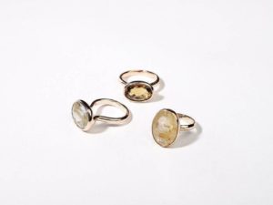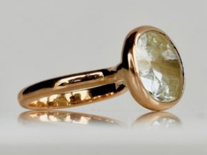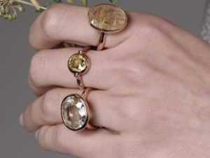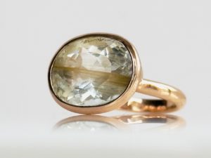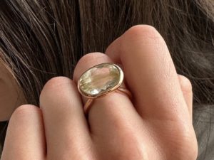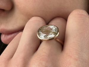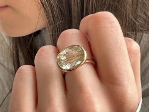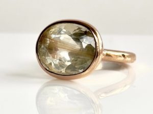 Full of natural characteristics and eye-catching sparkle, this simplicity rutilated white topaz ring makes a cool, contemporary statement. 12 Carat expertly polished gem reveals colorful flashes of fire dancing around fine golden needles. The topaz healing abilities are connected to spiritual and physical rejuvenation. It releases tension and promotes feelings of joy and happiness.